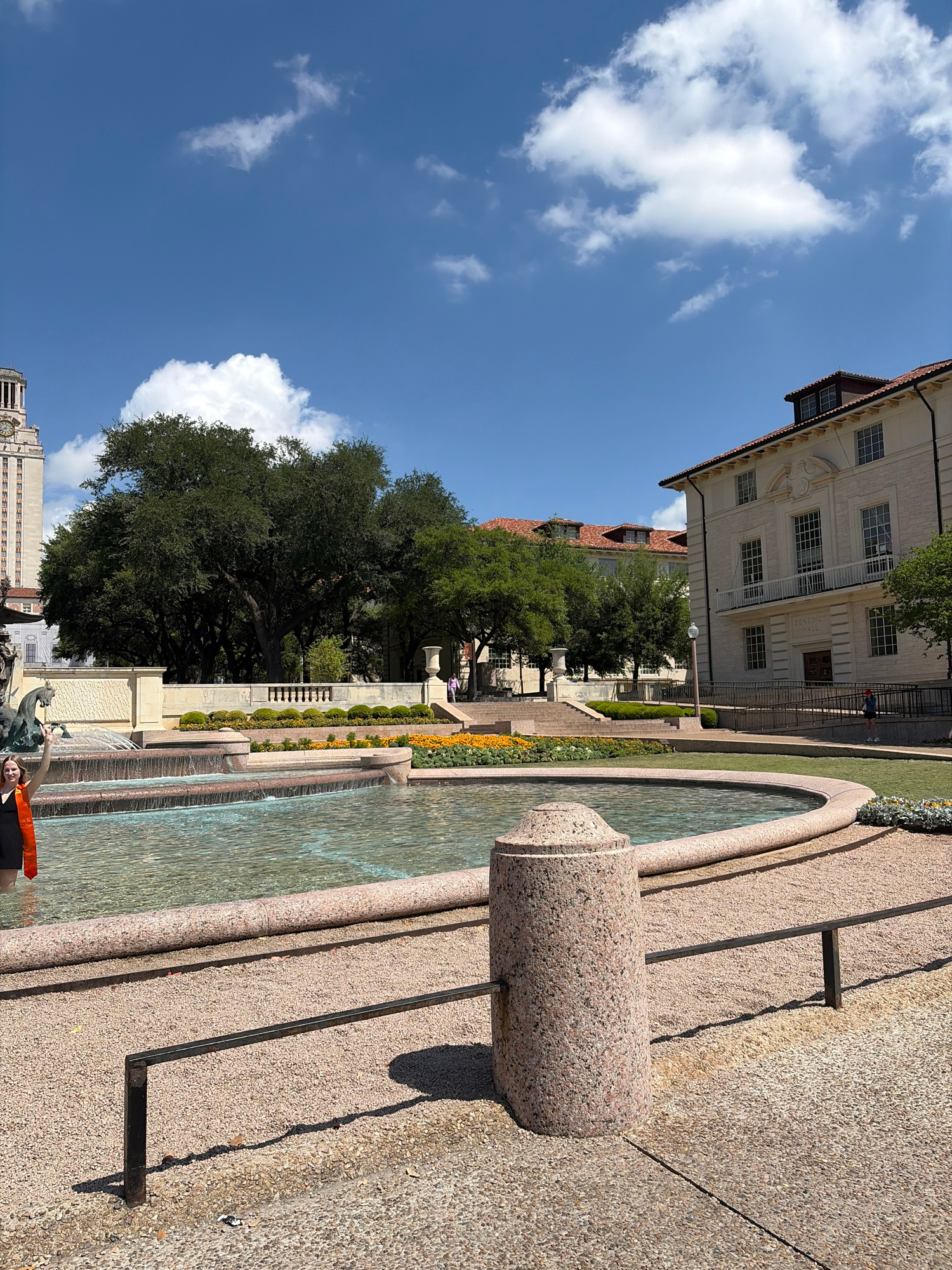 The image depicts the Littlefield Fountain at the University of Texas at Austin in Austin, Texas. The fountain is visible in the foreground, with water cascading down its tiers. Behind the fountain, t…read more