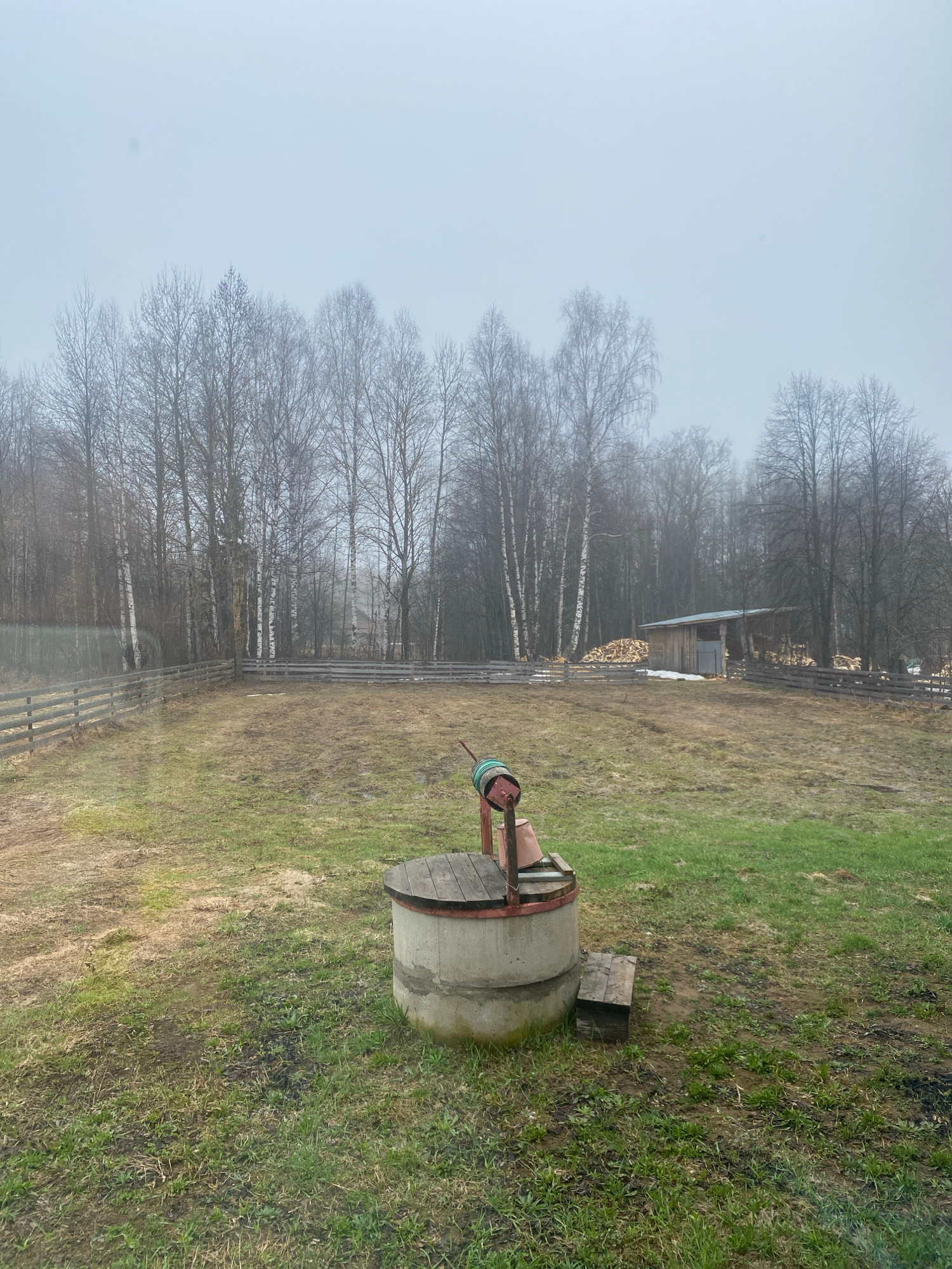The image shows a rural scene in Zhigalki, Russia on a foggy day. A concrete well with a metal frame and wooden cover is located in a grassy area, with a wooden block beside it. Beyond the well, a woo…read more