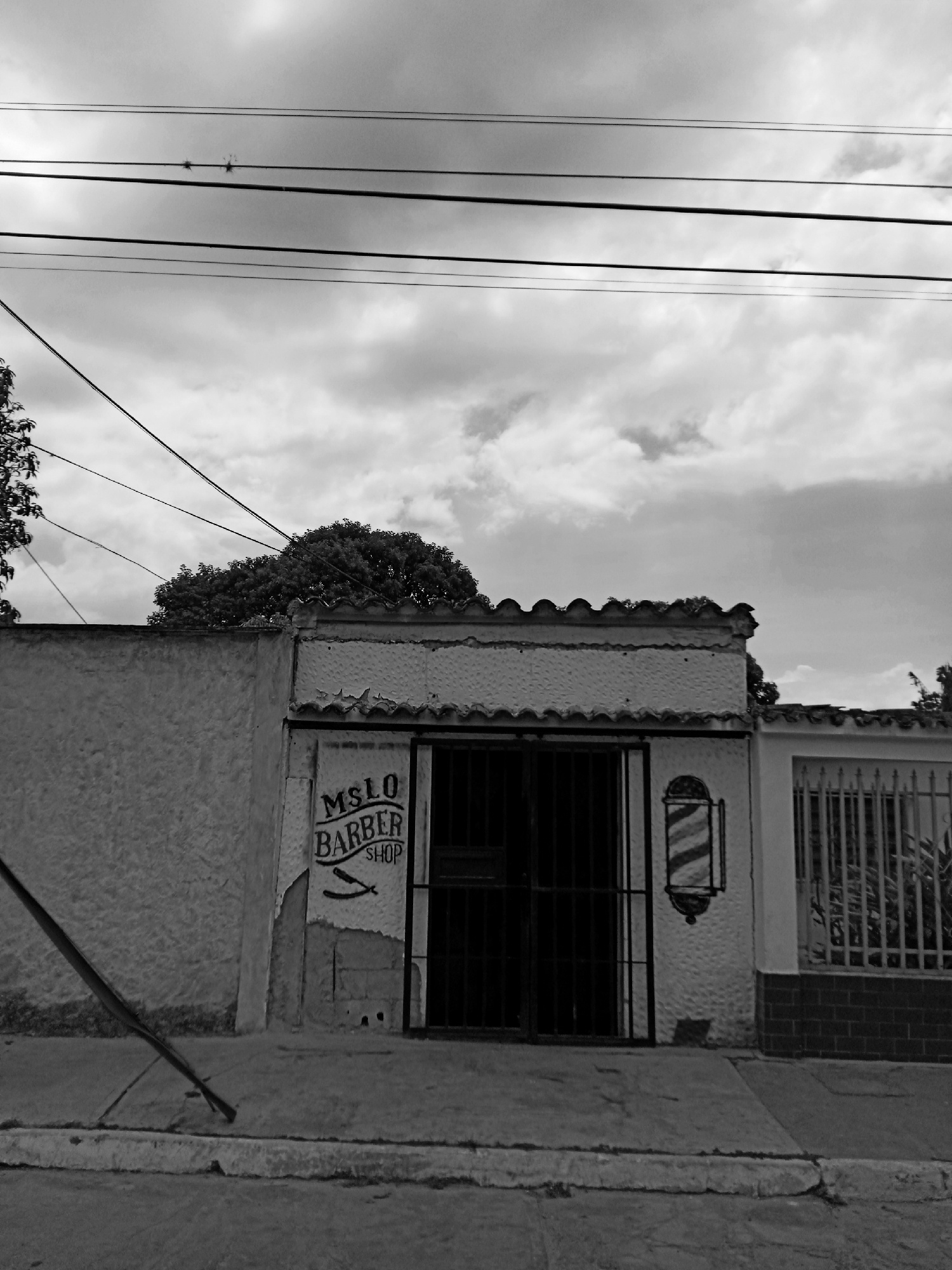 The image depicts the facade of a closed barber shop, likely in Montalbán, Venezuela, based on the architectural style. The shop front is aged and weathered, with crumbling plaster. The shop’s sign re…read more