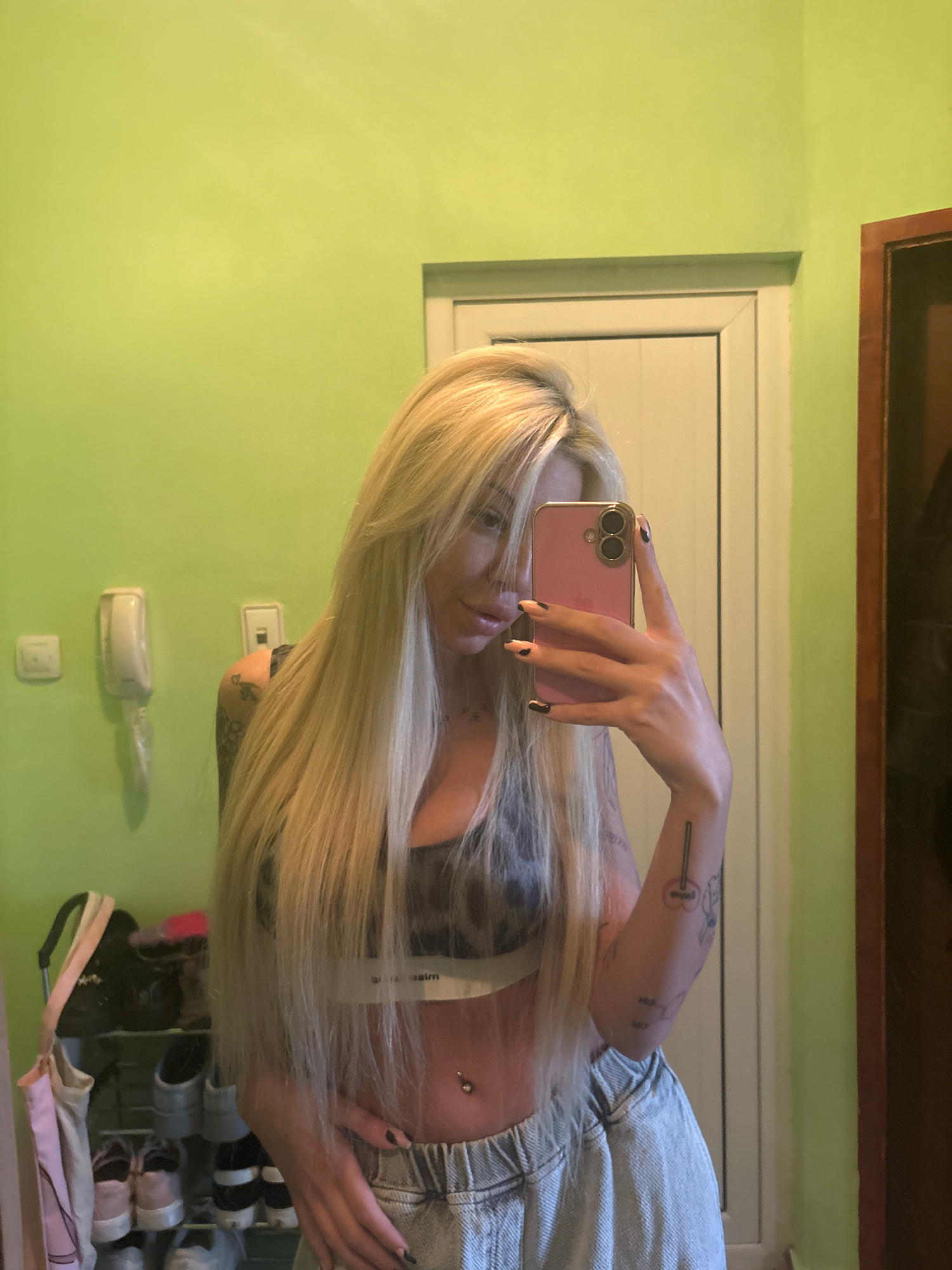 A woman is taking a selfie in front of a light green wall. She is holding a pink smartphone. The woman has long blonde hair that covers part of her face. She has a belly button piercing and is wearing…read more