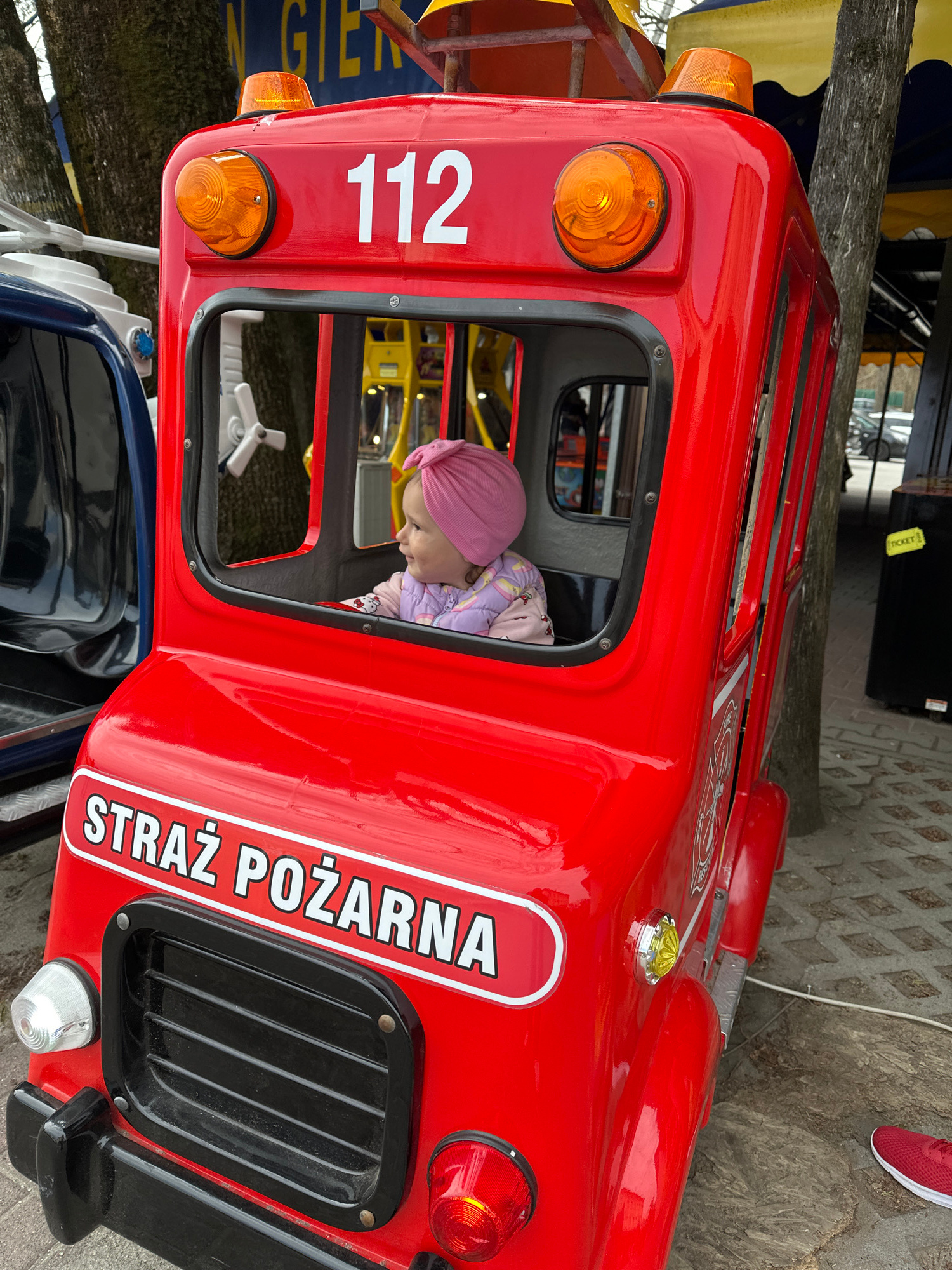 A young child with a pink head covering is seated inside a red coin-operated ride shaped like a fire truck. The ride has the number "112" prominently displayed on the front and the Polish words "STRAŻ…read more