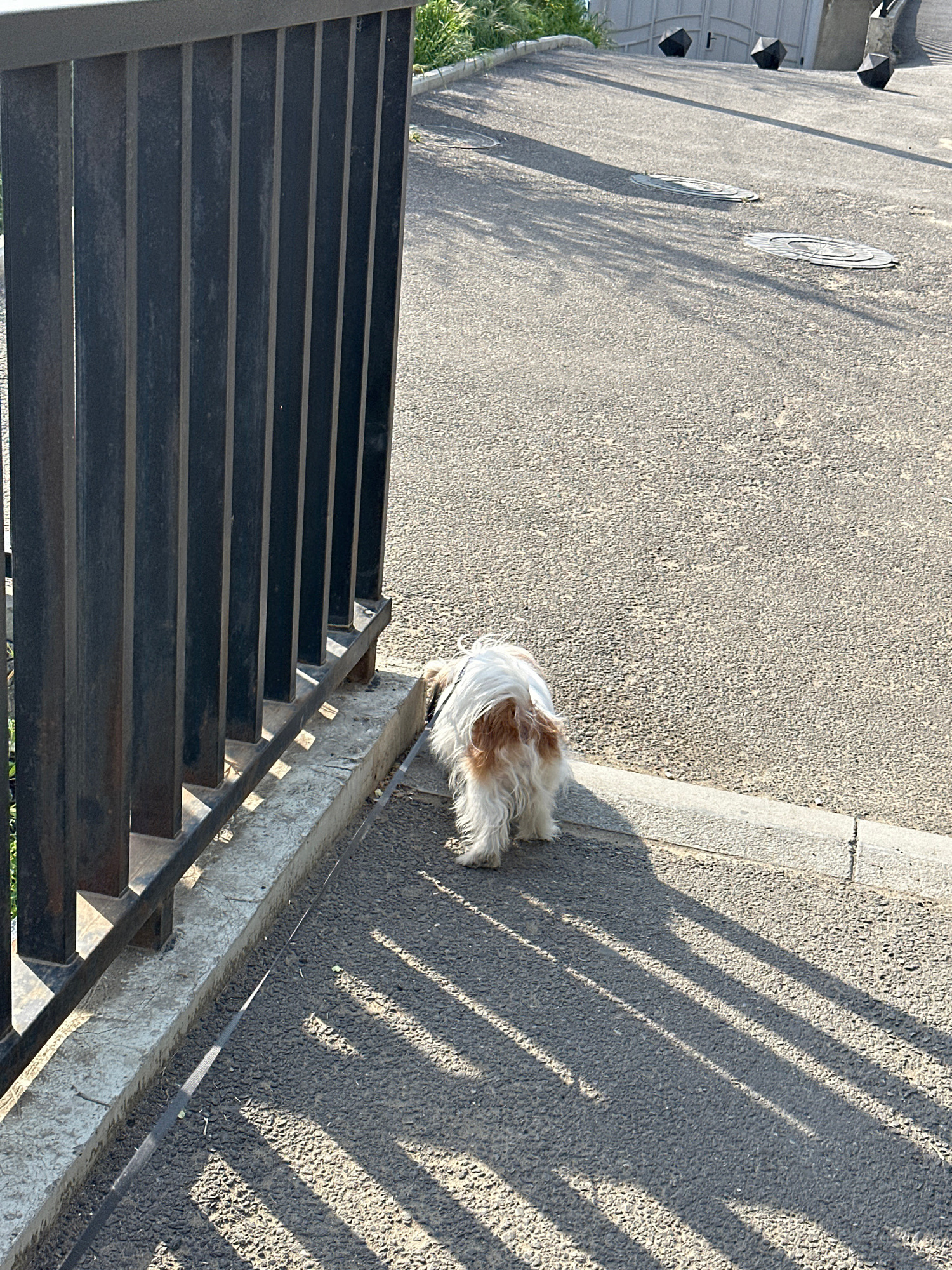 A dog sits on pavement at the edge of a set of stairs in an outdoor scene. The dog is small with white and light brown fur. The pavement has light-colored, linear shadows cast across it. To the left o…read more