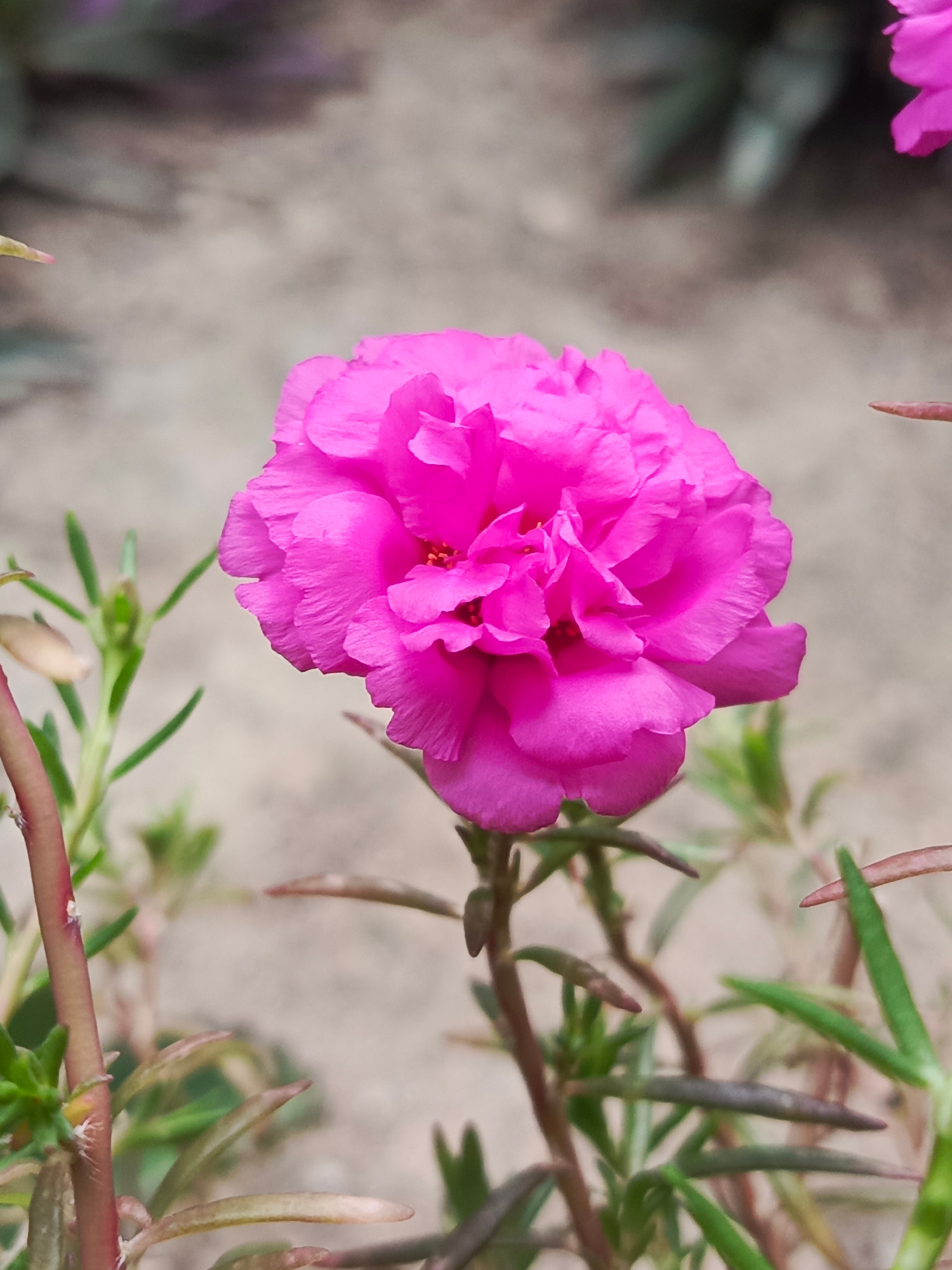 A close-up shot of a vibrant pink Moss Rose flower (Portulaca grandiflora) is the central focus. The flower is in full bloom with densely packed petals. The flower is supported by thin, reddish-brown…read more