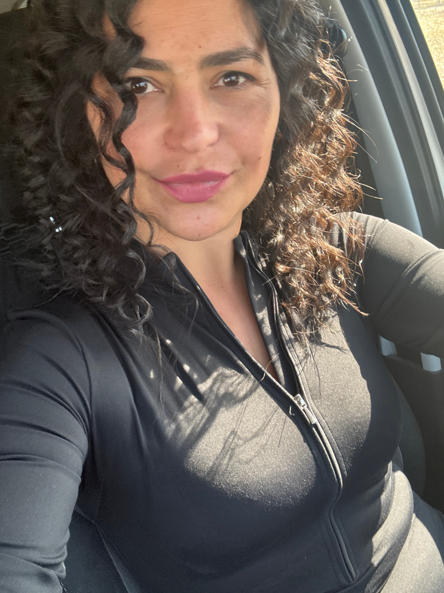 A close-up, eye-level portrait shows a woman inside what appears to be a car, likely a selfie. She is positioned horizontally, with her head resting or angled back, looking directly at the viewer with…read more