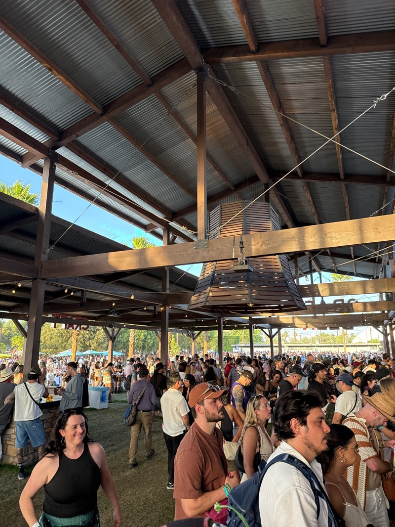 The image shows a large crowd of people gathered at an outdoor event in what appears to be a park or open space. The event is taking place under a large, open-sided structure with a corrugated metal r…read more