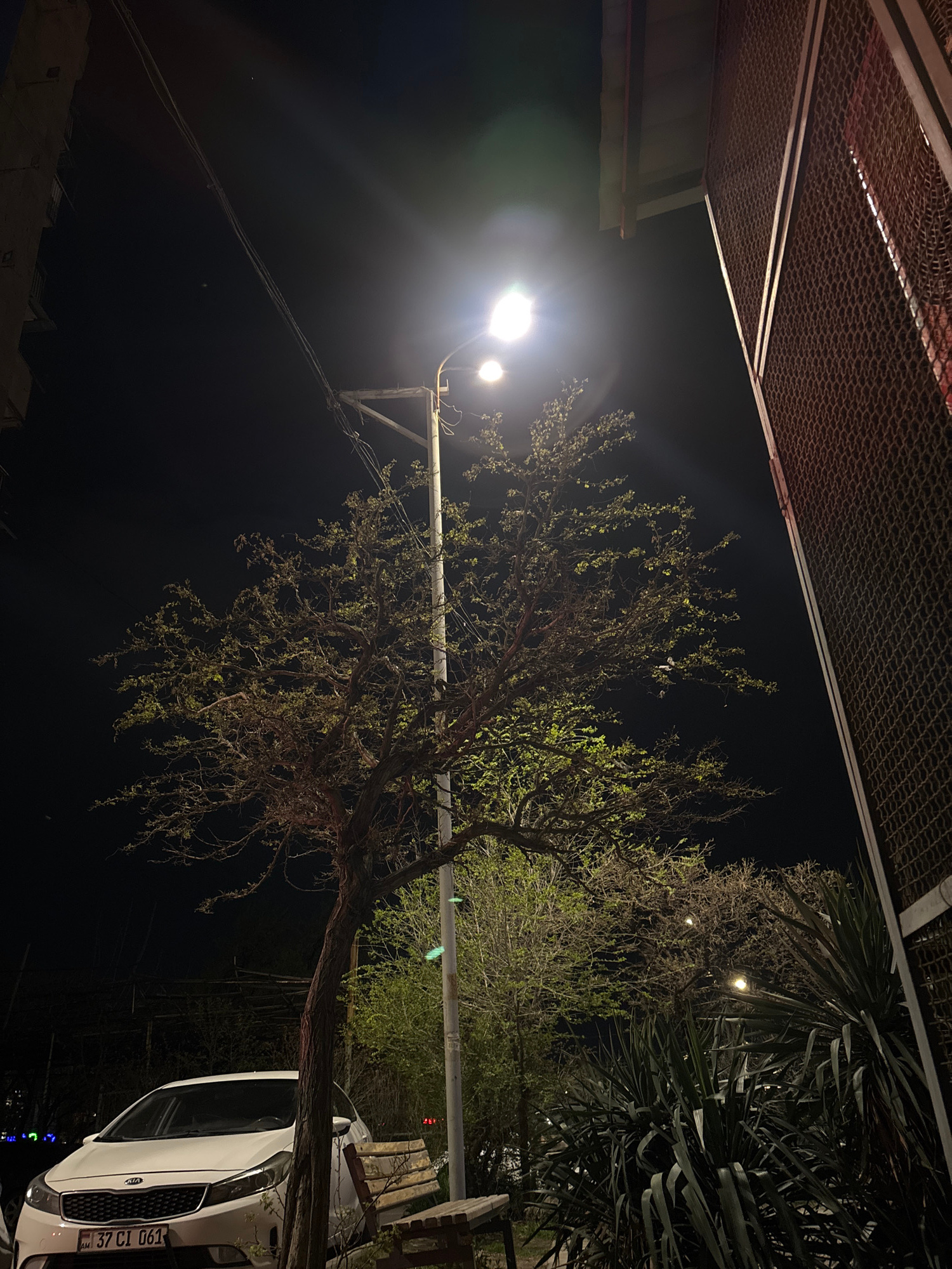 The image depicts an urban night scene, likely in Yerevan, Armenia, as suggested by the car's license plate. A streetlamp illuminates a sparsely foliated tree, casting light on a parked white car. Ove…read more