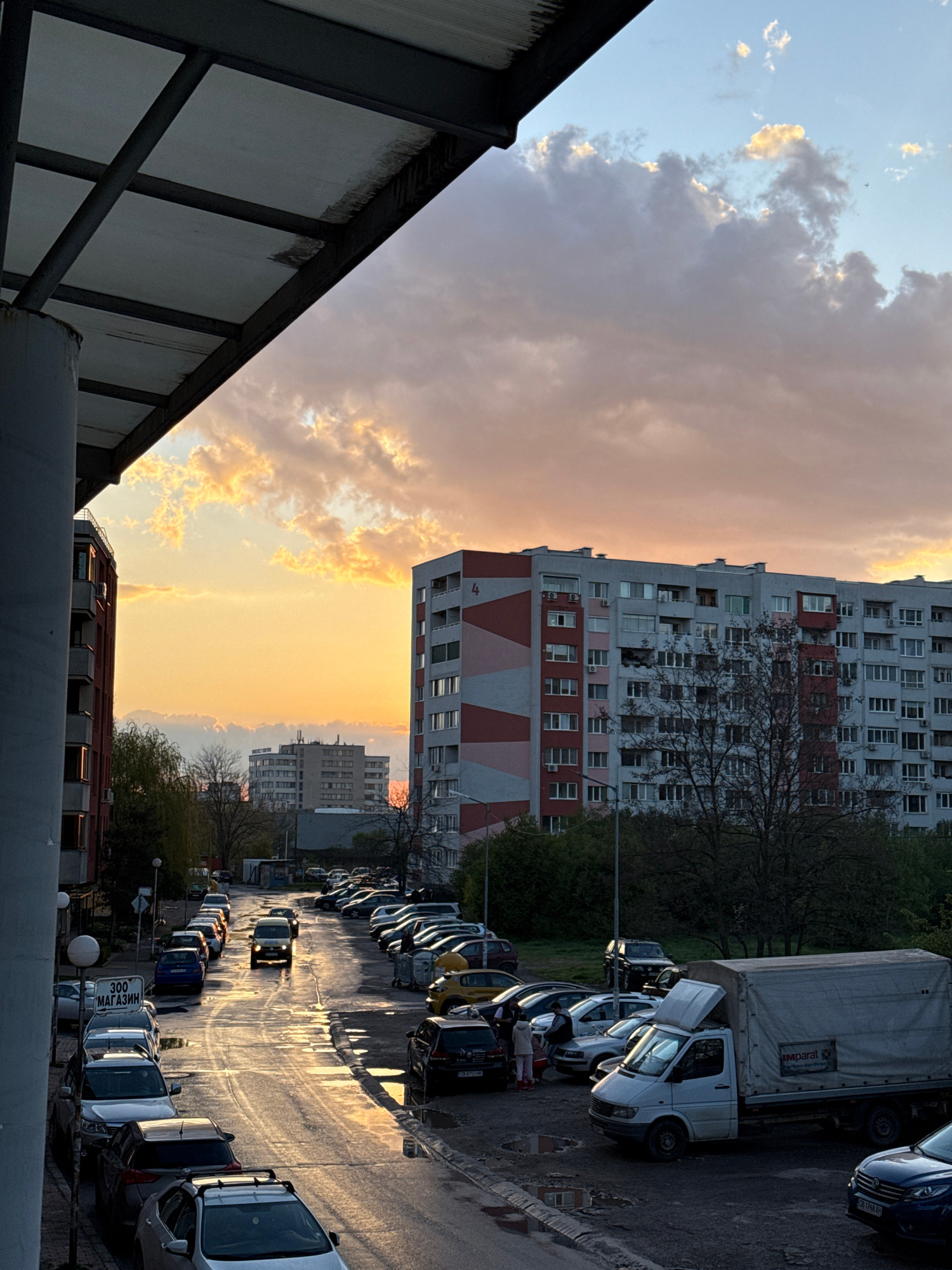 The image captures a street in Sofia, Bulgaria, at sunset. Tall apartment buildings dominate the background, illuminated by the golden light. Below, a street lined with parked cars reflects the sunlig…read more