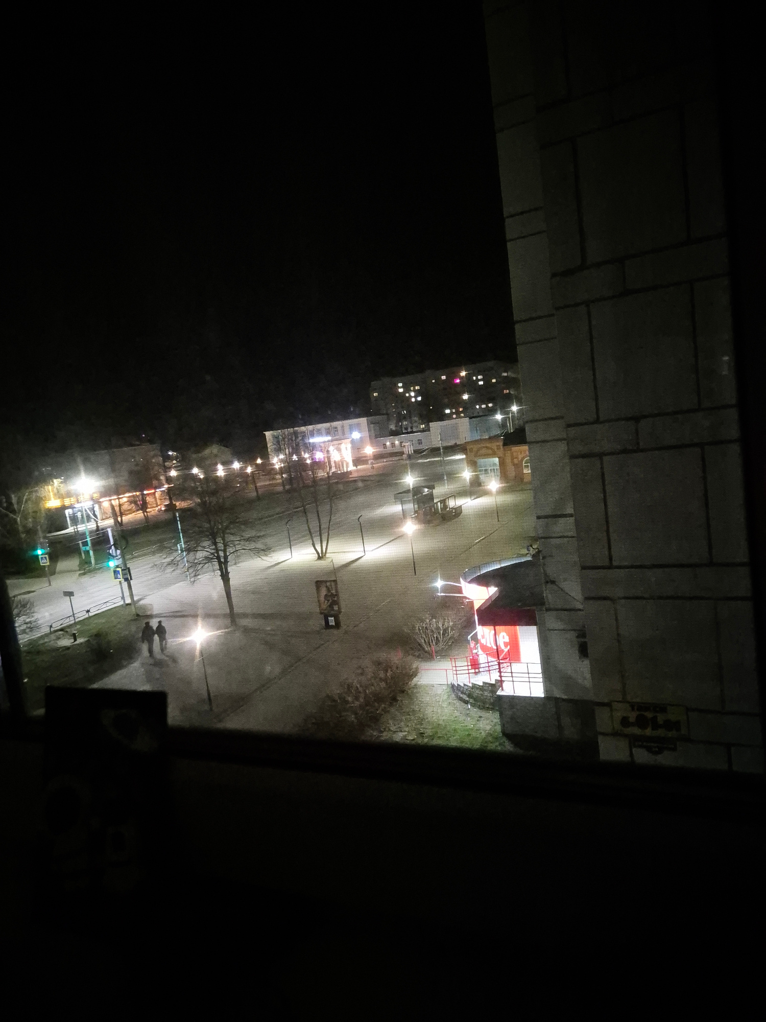 The image depicts a night view from an elevated position, possibly a high-rise building or apartment, overlooking a street scene in the city of Chaikovsky, Russia. The perspective is slightly skewed,…read more