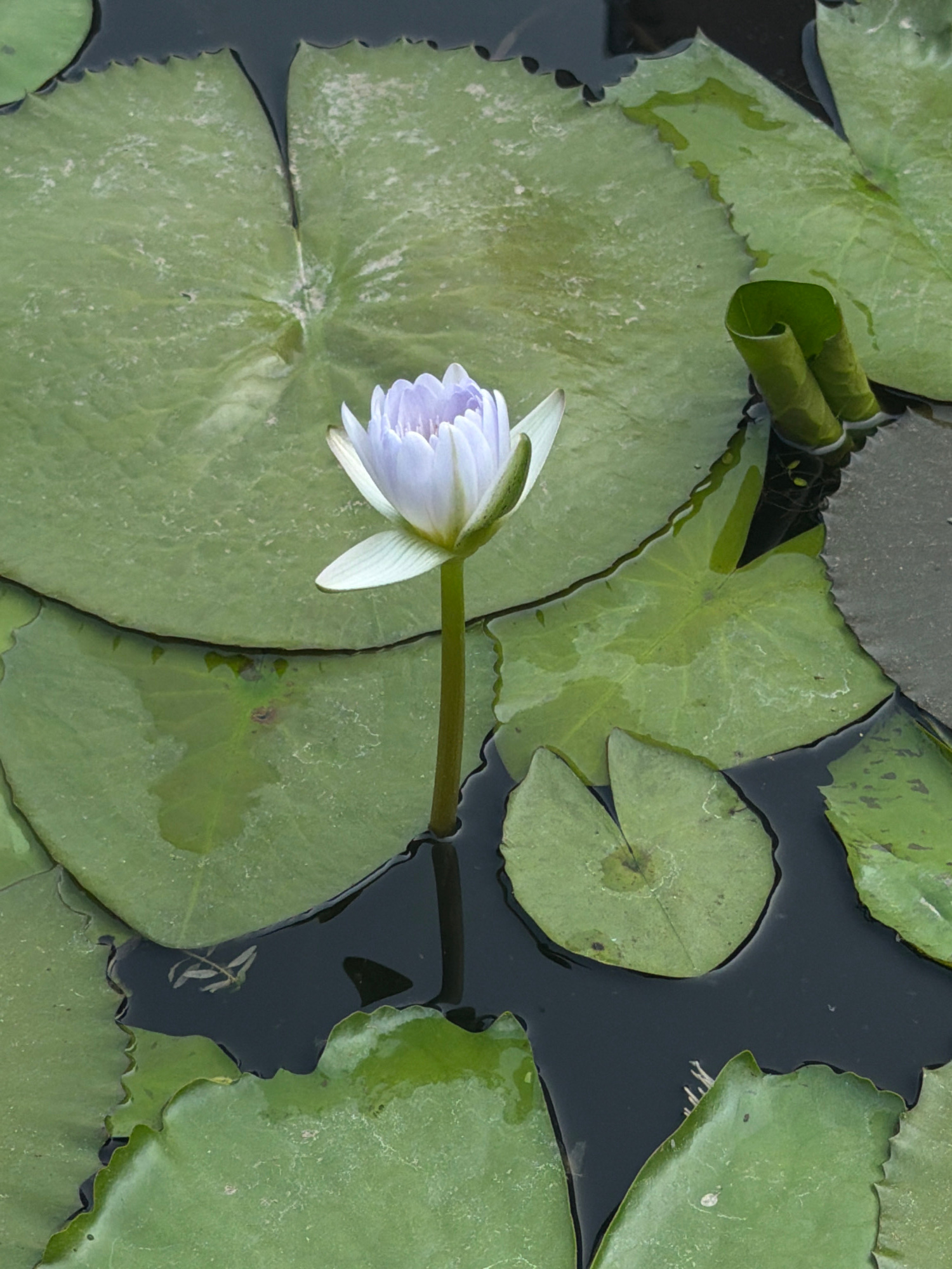 The image depicts a water lily with a light purple flower floating among several lily pads in dark water. The lily pads are various shades of green and have slightly jagged edges. A single flower with…read more