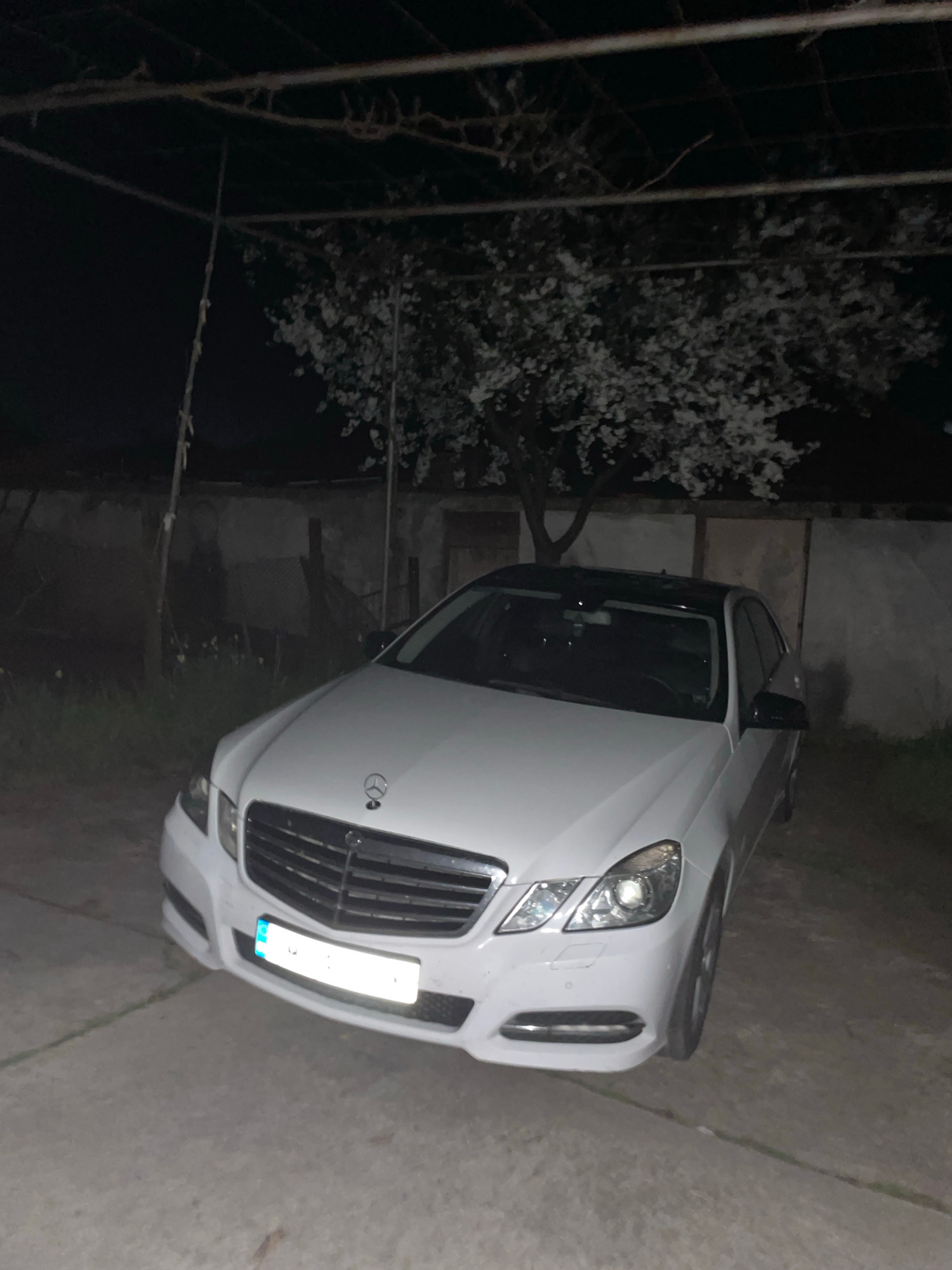 The image depicts a white Mercedes-Benz E-Class parked on a concrete surface. The car is positioned at an angle, facing toward the right of the frame. A flowering tree is visible on the left side of t…read more
