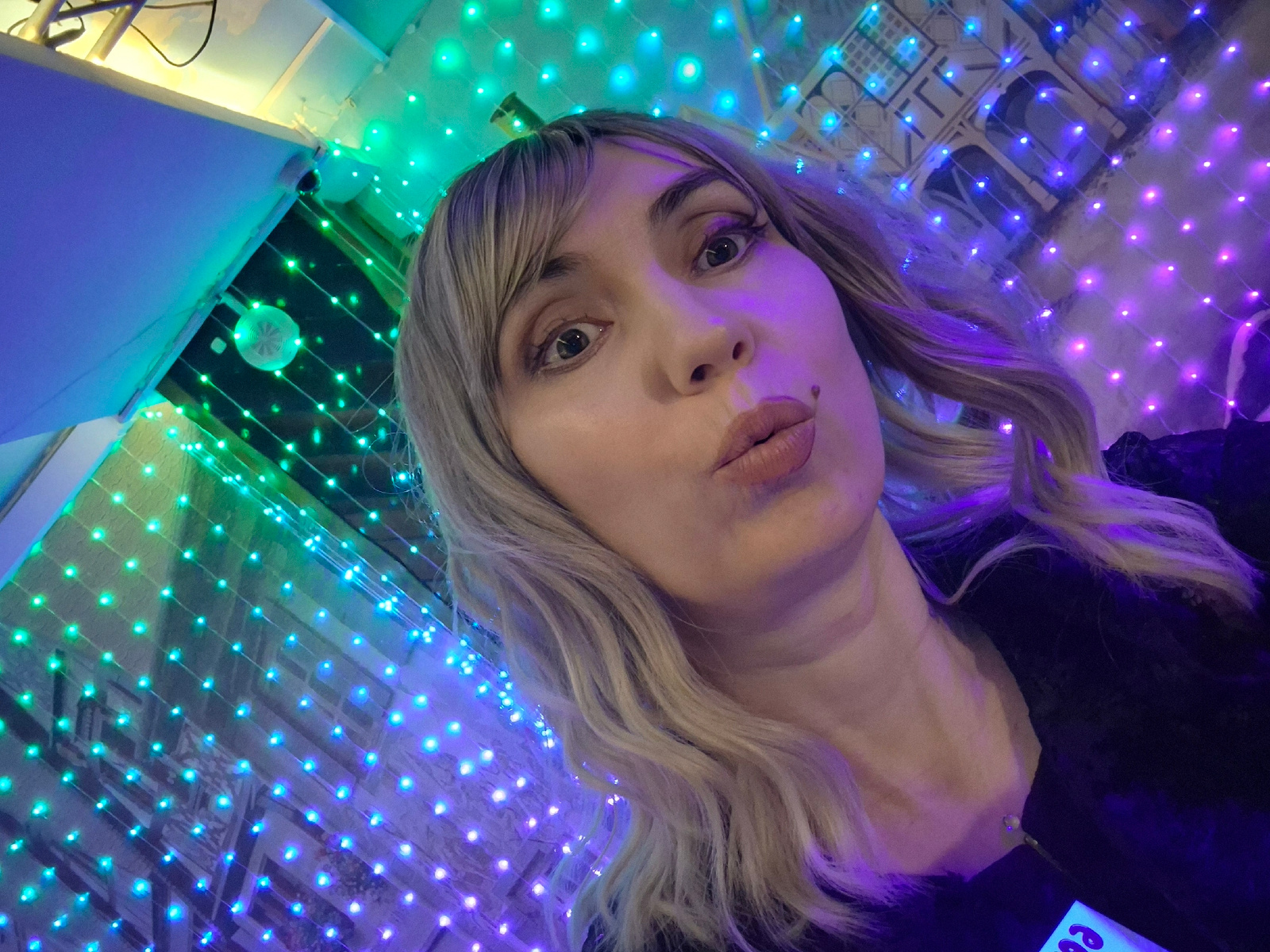A woman with blond wavy hair and bangs is taking a selfie in a room decorated with strings of colorful LED lights. The lights transition from green to blue to purple. A disco ball is visible near the…read more