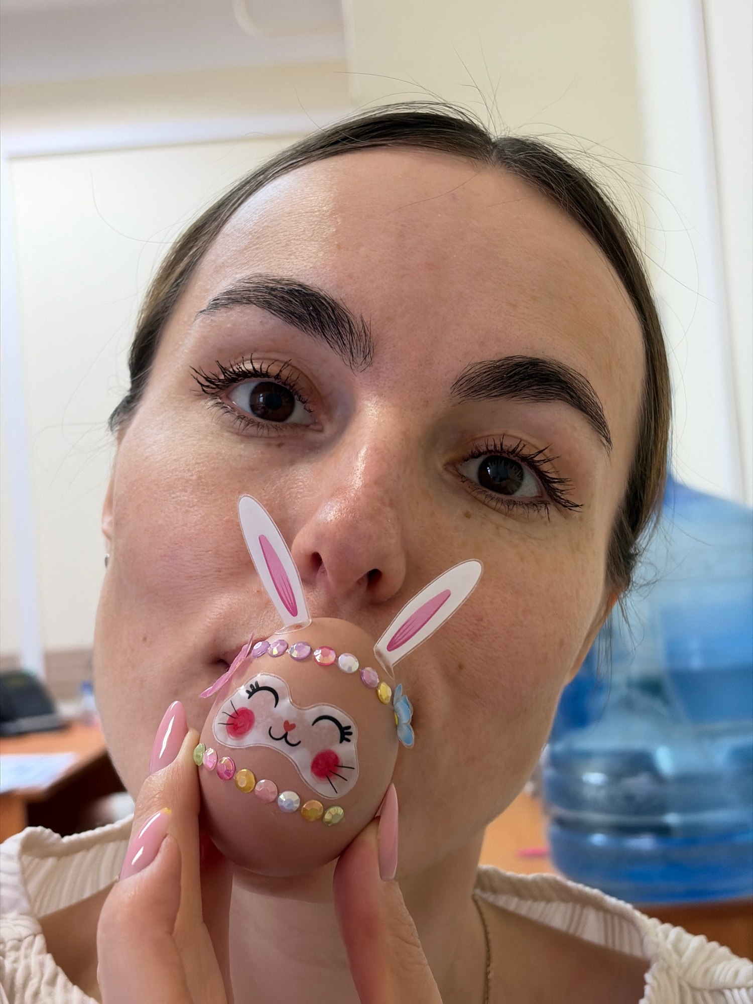 A woman is holding an Easter egg up to her face. The egg is decorated with a rabbit face, ears, and colored jewels. The woman has dark hair and brown eyes. She is wearing a white top. The background is out of focus, but appears to be an indoor setting with a large water cooler in the background. No information is available to suggest the location is Izhevsk, Russia. | Open Wire