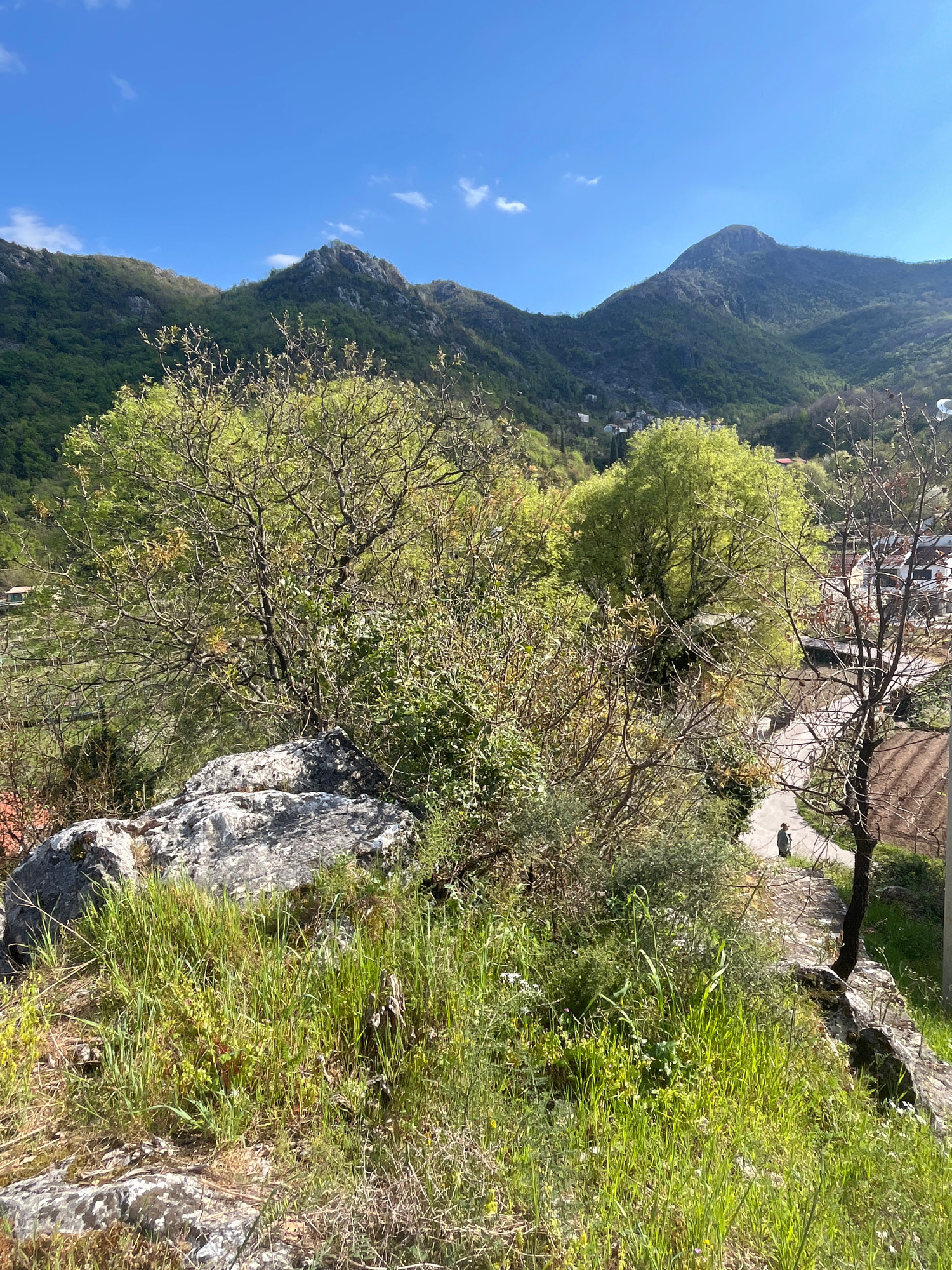 The image captures a scene in Godinje, Montenegro. A prominent mountain covered in green foliage rises in the background against a blue sky with scattered clouds. In the foreground, there are trees wi…read more