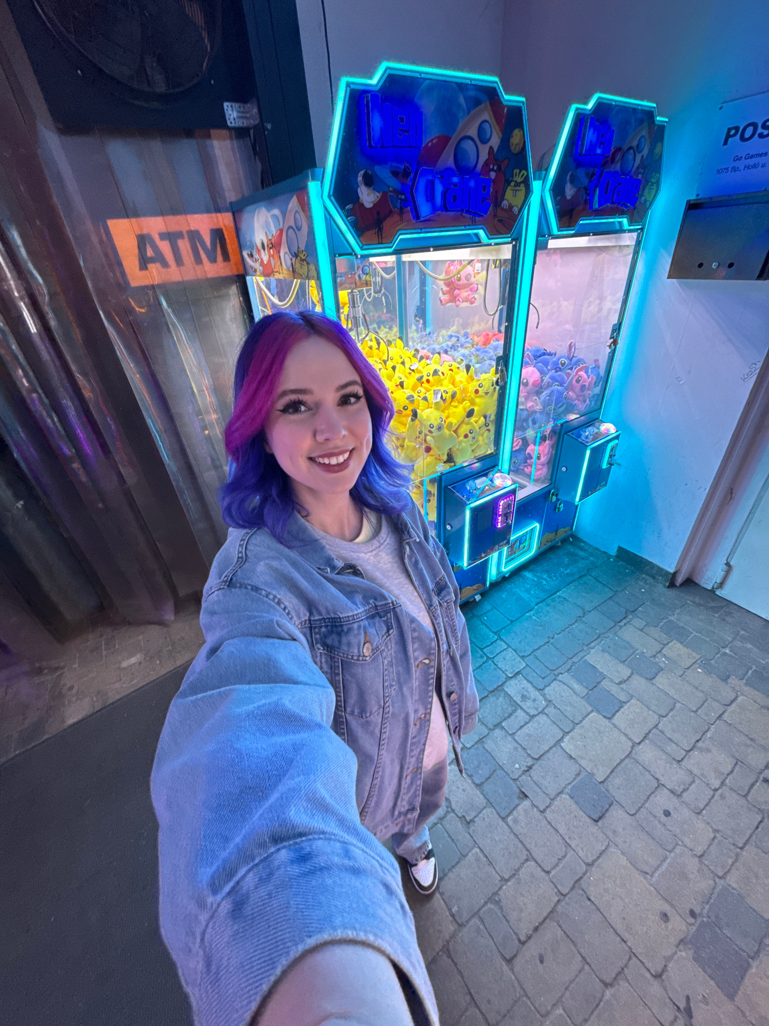A woman is taking a selfie in front of two claw machine arcade games. The woman has blue and purple hair, wears a denim jacket and is smiling. The arcade games are filled with plush toys. One game has…read more