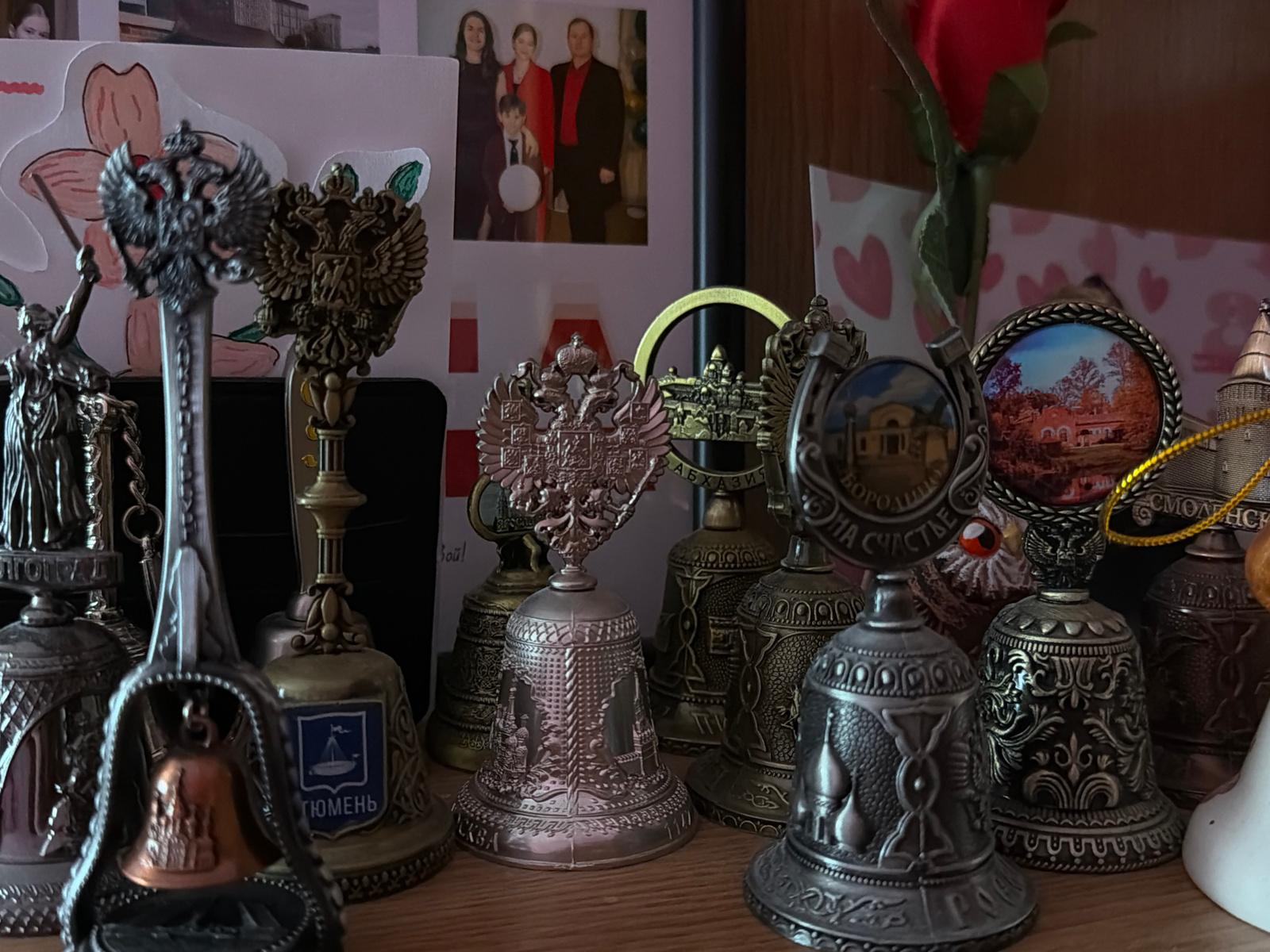 The image displays a detailed collection of decorative metallic bells, predominantly silver and bronze-toned, arranged on a wooden surface, likely a shelf, against a light background. These bells vary…read more