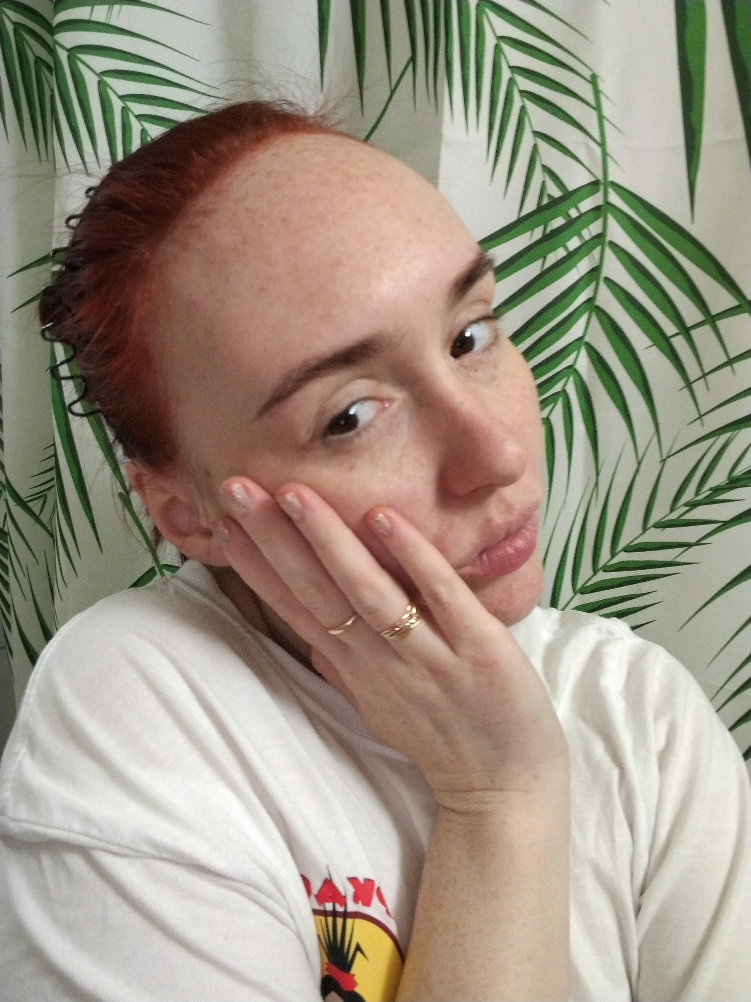 A light-skinned person with red hair, freckles, and a gold ring on their hand poses for a selfie. They are wearing a white T-shirt and are positioned in front of a patterned wall or curtain depictingβ¦read more