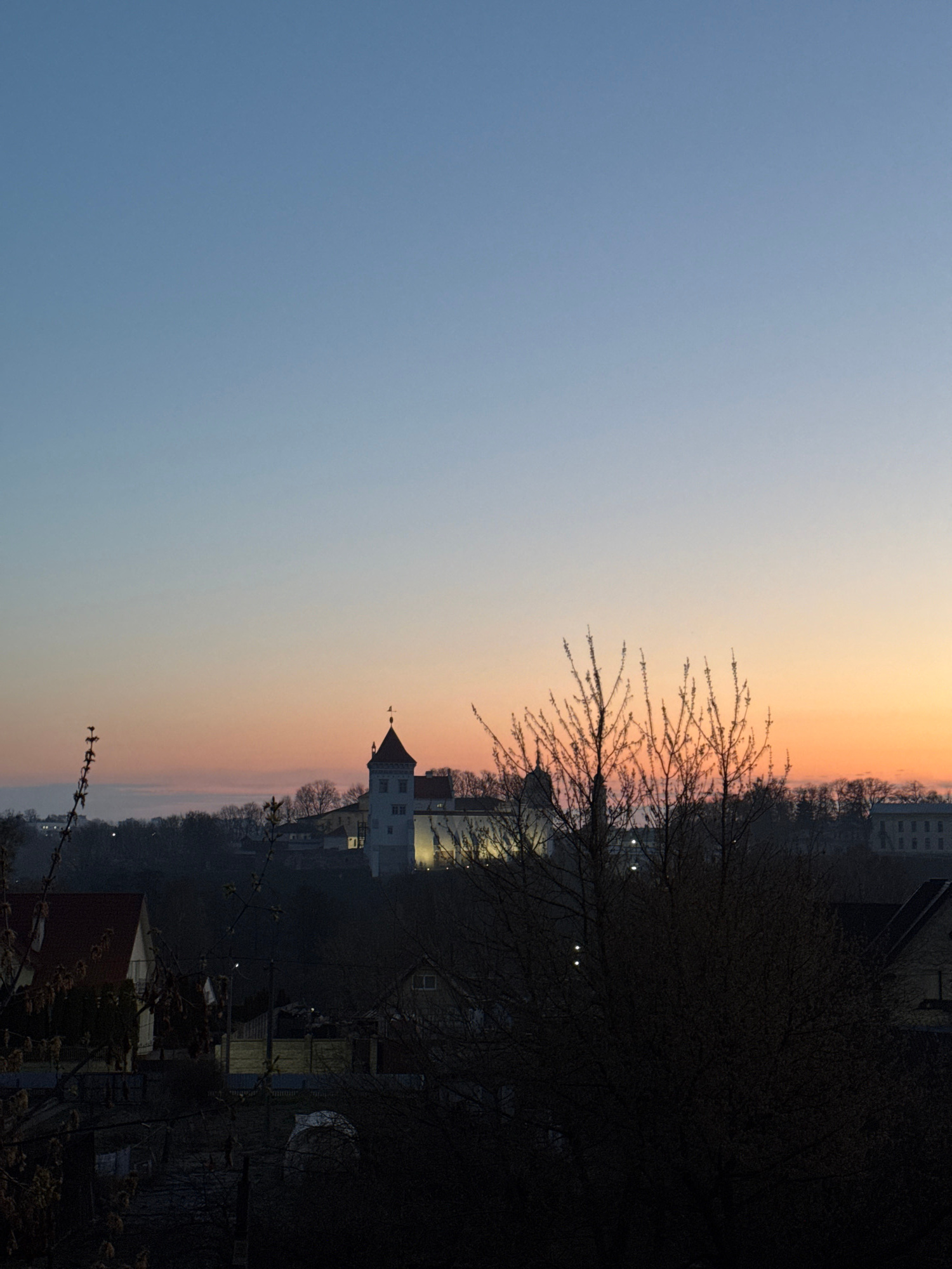 The image shows a view of Hrodna, Belarus at dusk or dawn. The sky transitions from blue to orange. A building with a tower is visible among trees, likely a historic structure or church. Other buildinβ¦read more