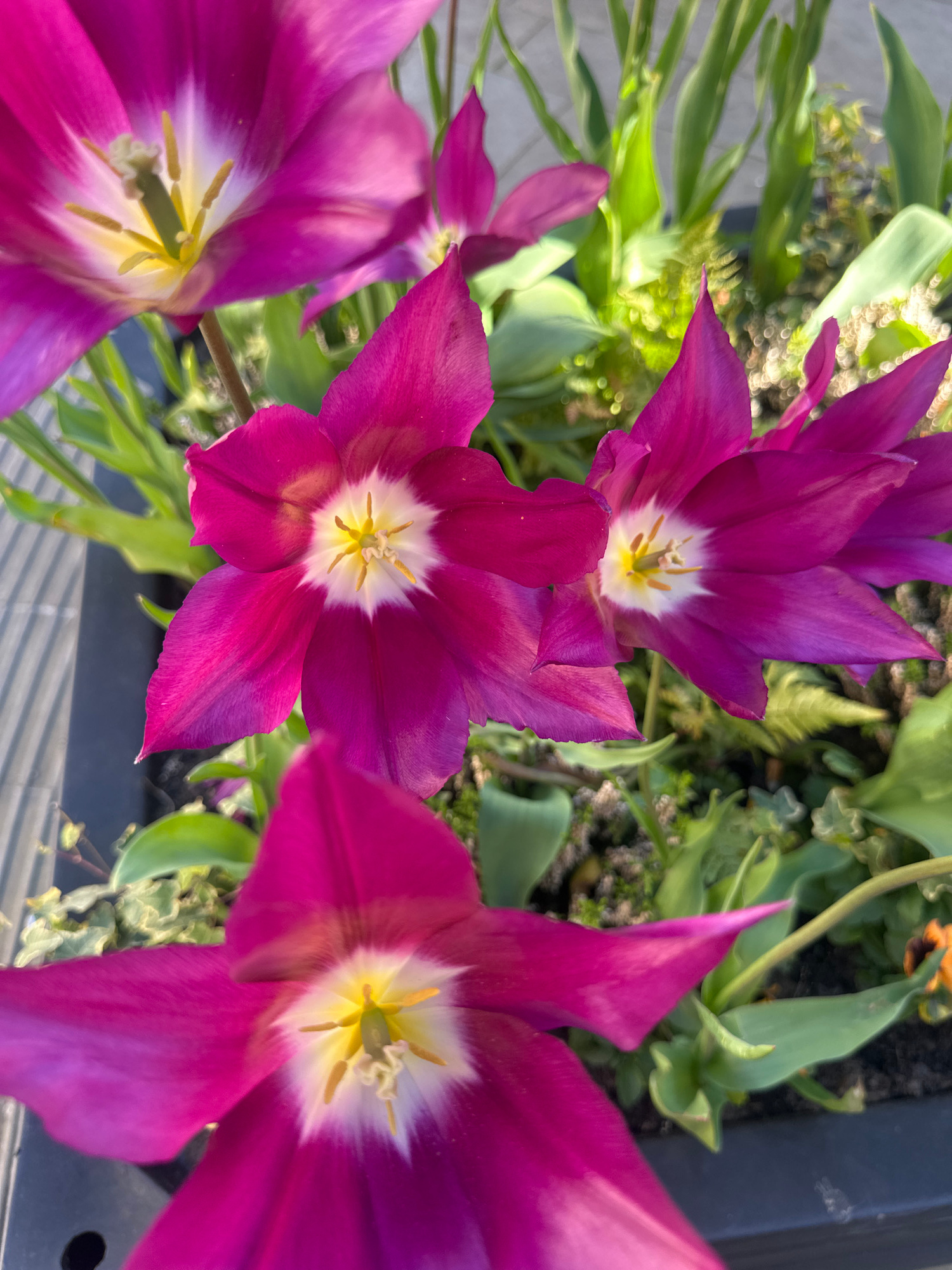 The image depicts a close-up, high-angle view of purple tulips in bloom. The petals have a pointed shape and display a gradient of purple, with the base of the petals near the center of the flower bei…read more