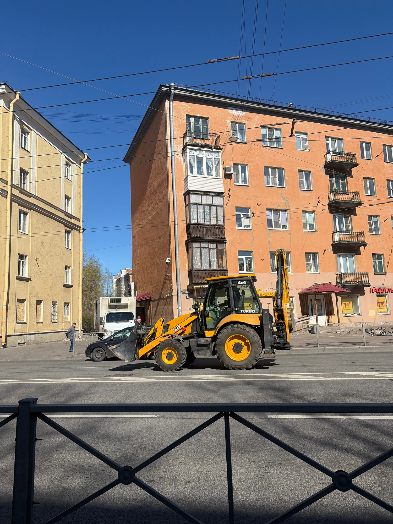 This image depicts an urban street scene in Saint Petersburg, Russia, under a clear, bright blue sky on a sunny day, likely late morning or early afternoon, with sharp shadows visible. The scene is d…read more