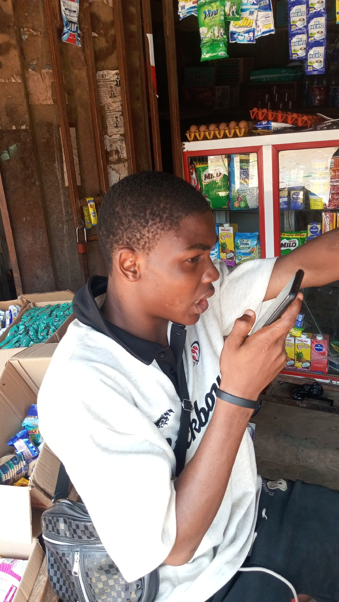 The image shows a young man with short, dark hair looking at a smartphone in his hand, his expression suggesting he is speaking or otherwise engaged with the device. He is wearing a white t-shirt withβ¦read more