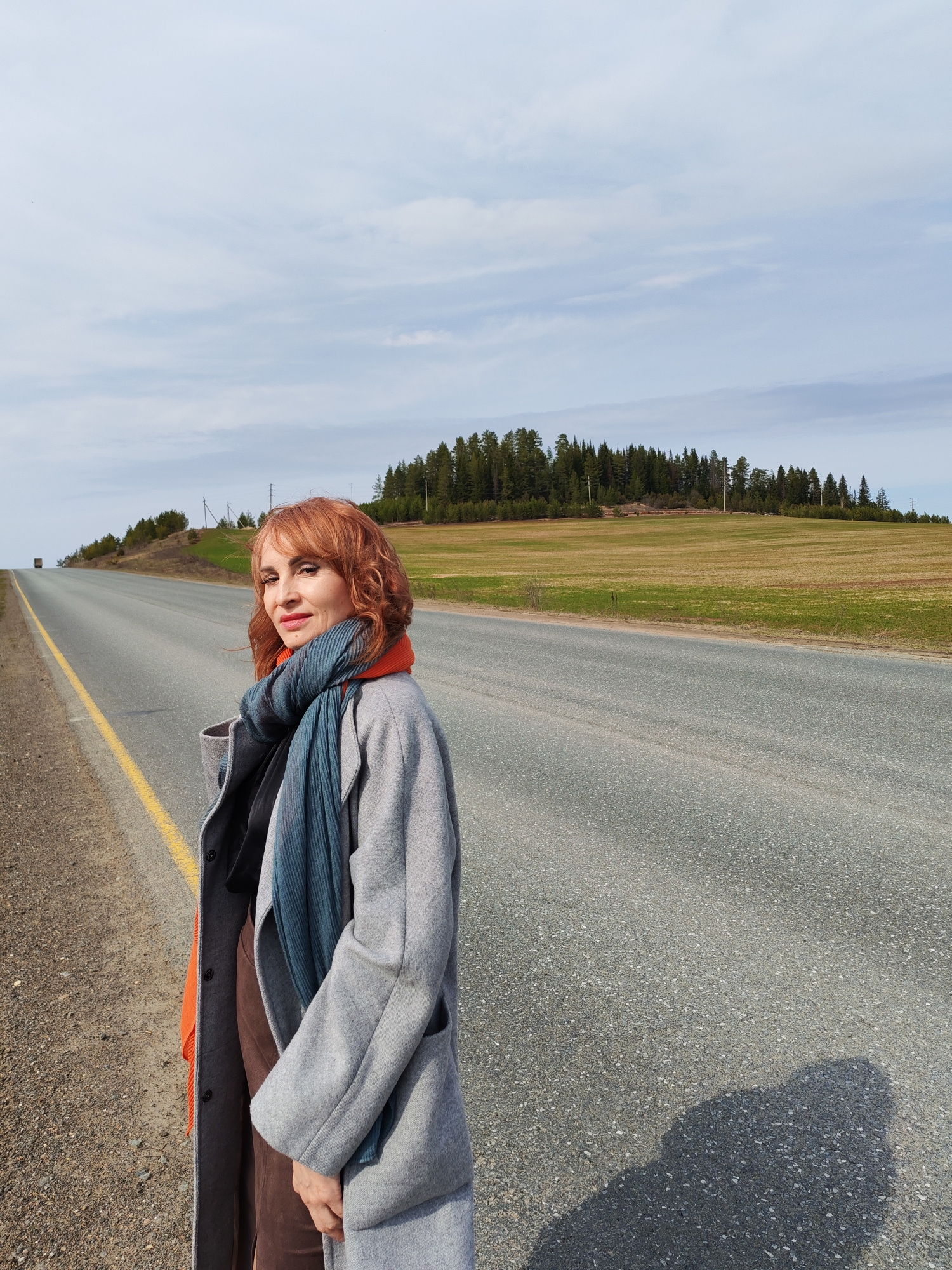 A woman stands on the shoulder of a two-lane highway in Нечкино, Russia. She has red hair and is wearing a gray coat, a blue scarf, and an orange undershirt. To the right of the road is a field with a…read more