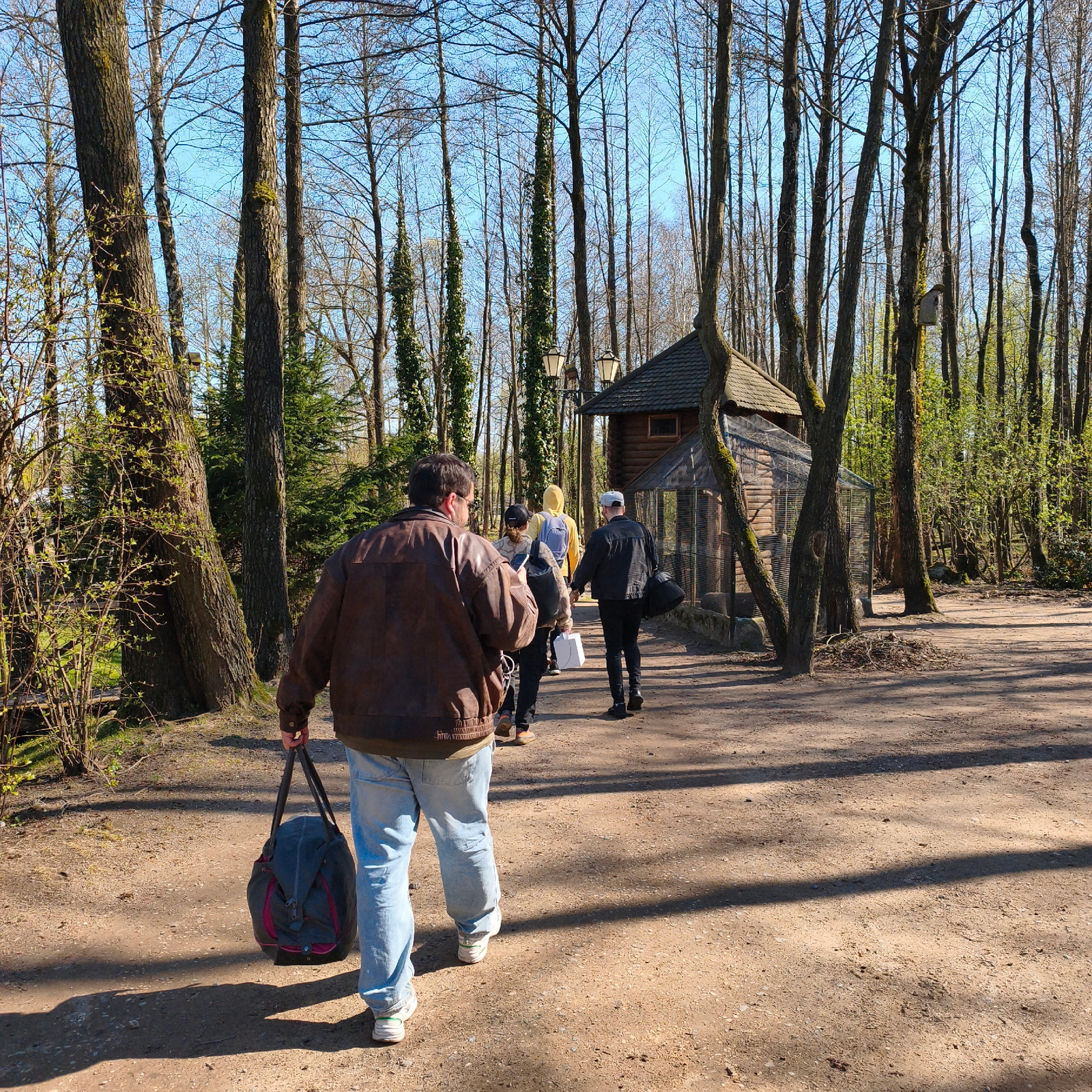 A group of people walks along a sunlit dirt path through a wooded area. In the foreground, a man, seen from behind, wears a brown leather jacket, light blue jeans, and white sneakers, carrying a dark…read more