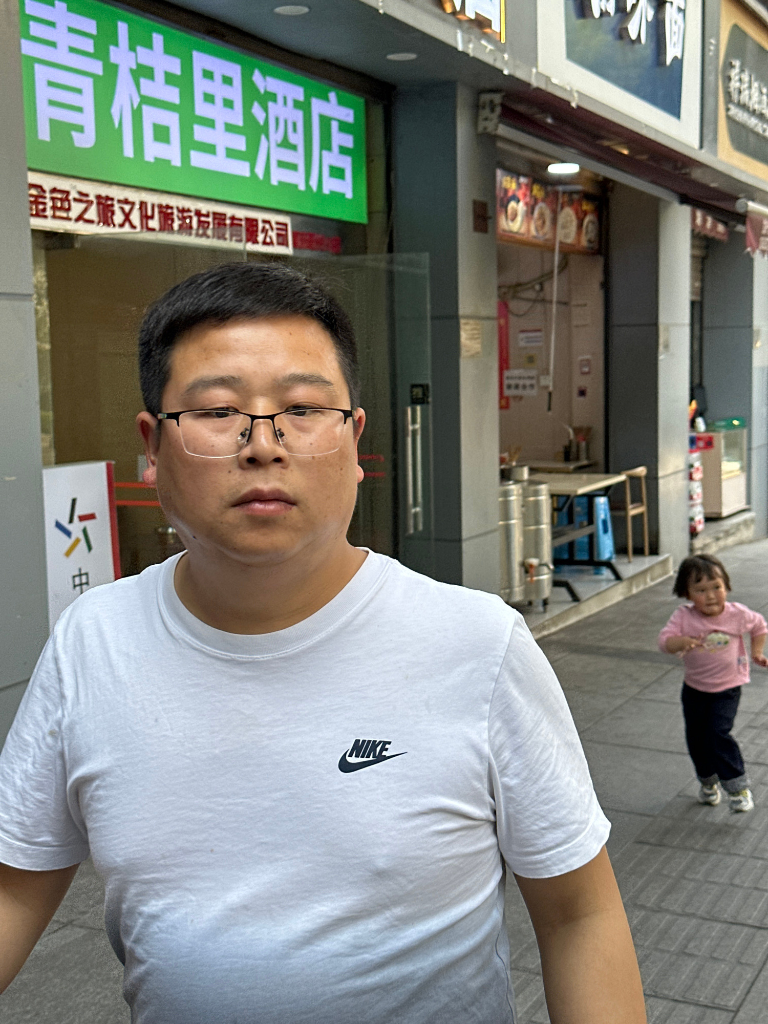A man wearing glasses and a white Nike t-shirt stands on a sidewalk in the Yuzhong District of China. In the background, a child in a pink shirt and dark pants stands further down the sidewalk. A sign…read more