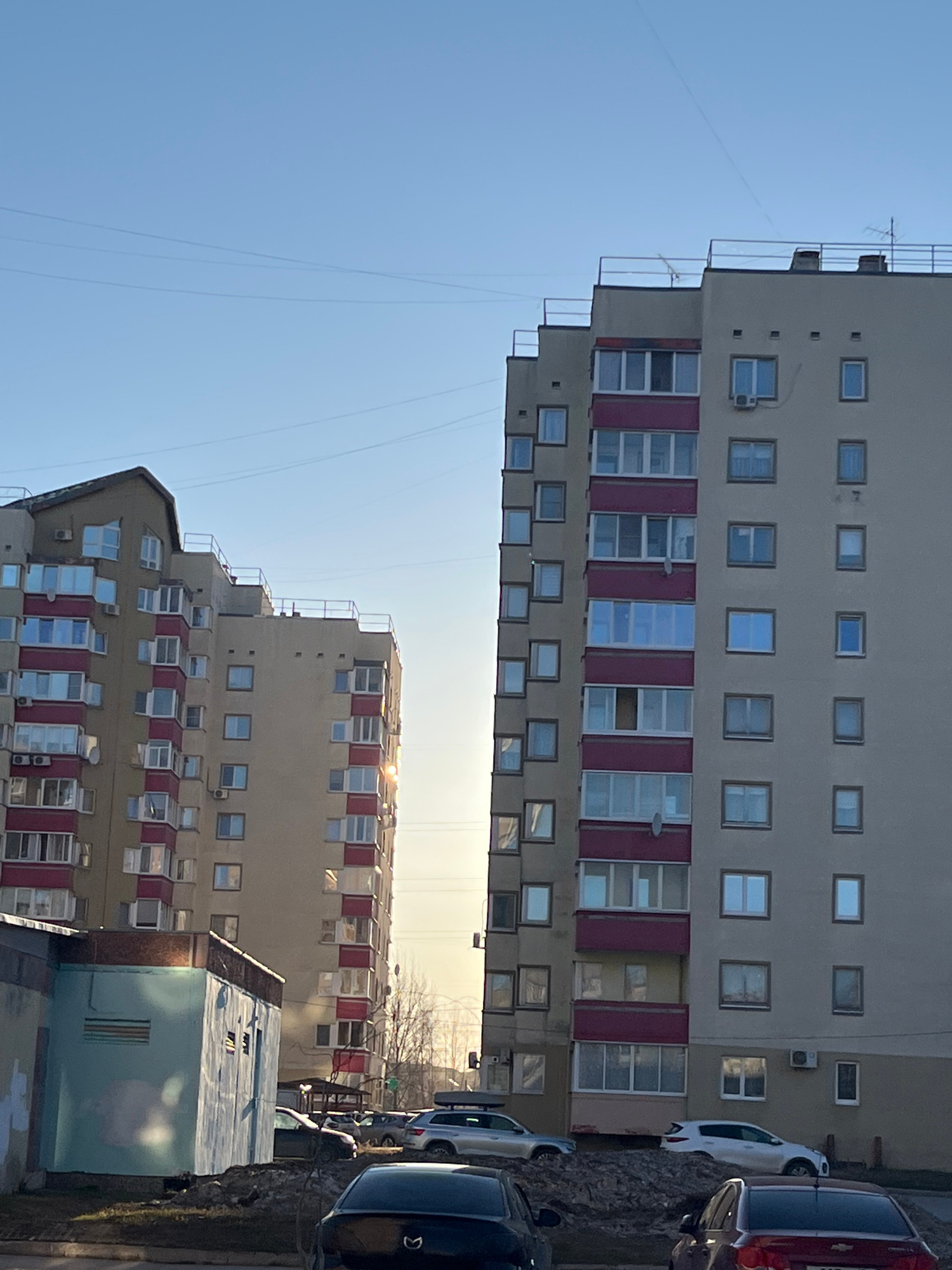 The image depicts a scene in Chaikovsky, Russia. Two Soviet-era apartment buildings dominate the frame, displaying a repetitive grid of windows and balconies. The buildings feature a light-colored fac…read more