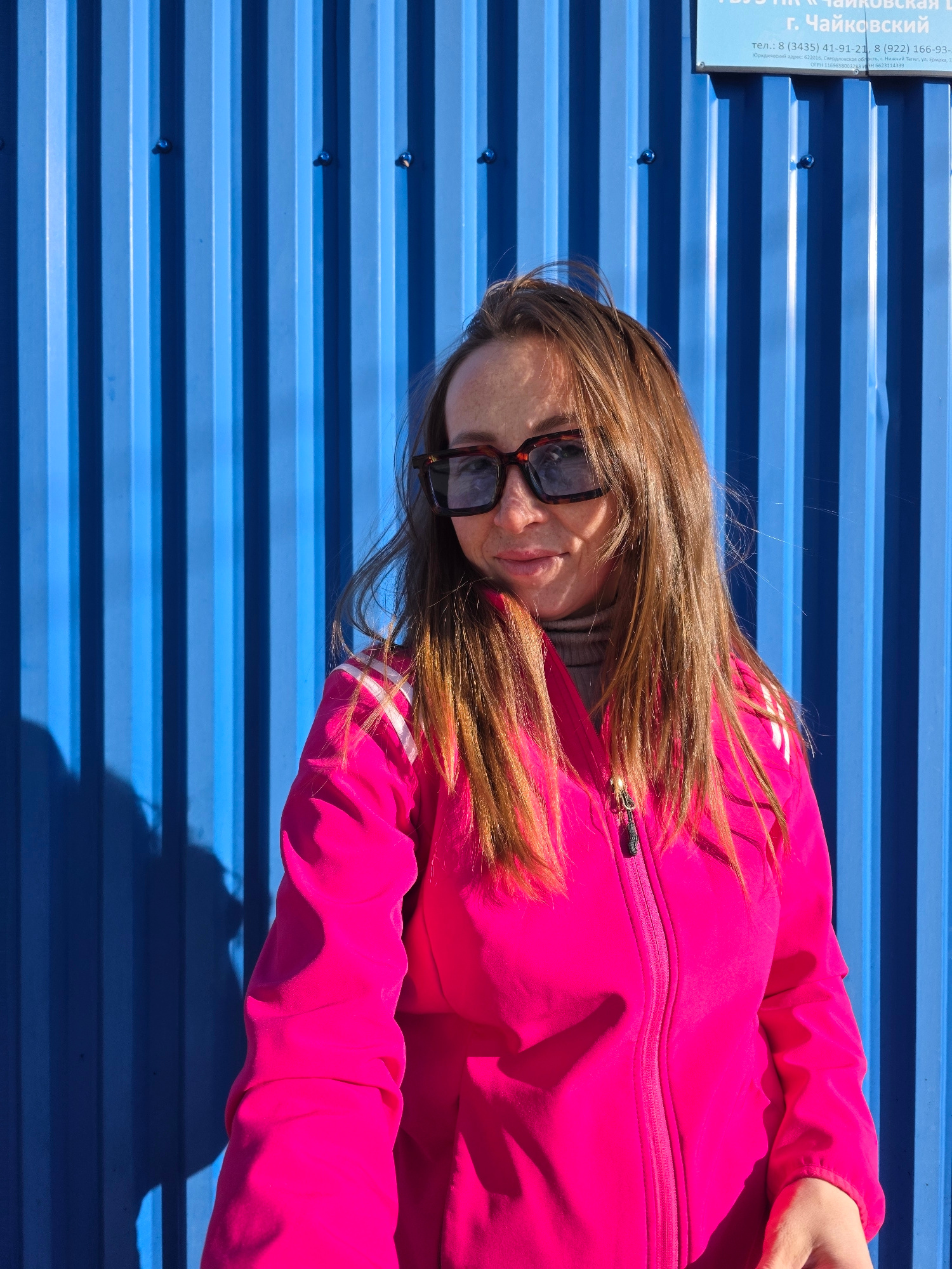 A woman with long brown hair and sunglasses is lying on a blue corrugated metal surface. She is wearing a bright pink jacket with white stripes on the sleeves. The background is a blue corrugated meta…read more