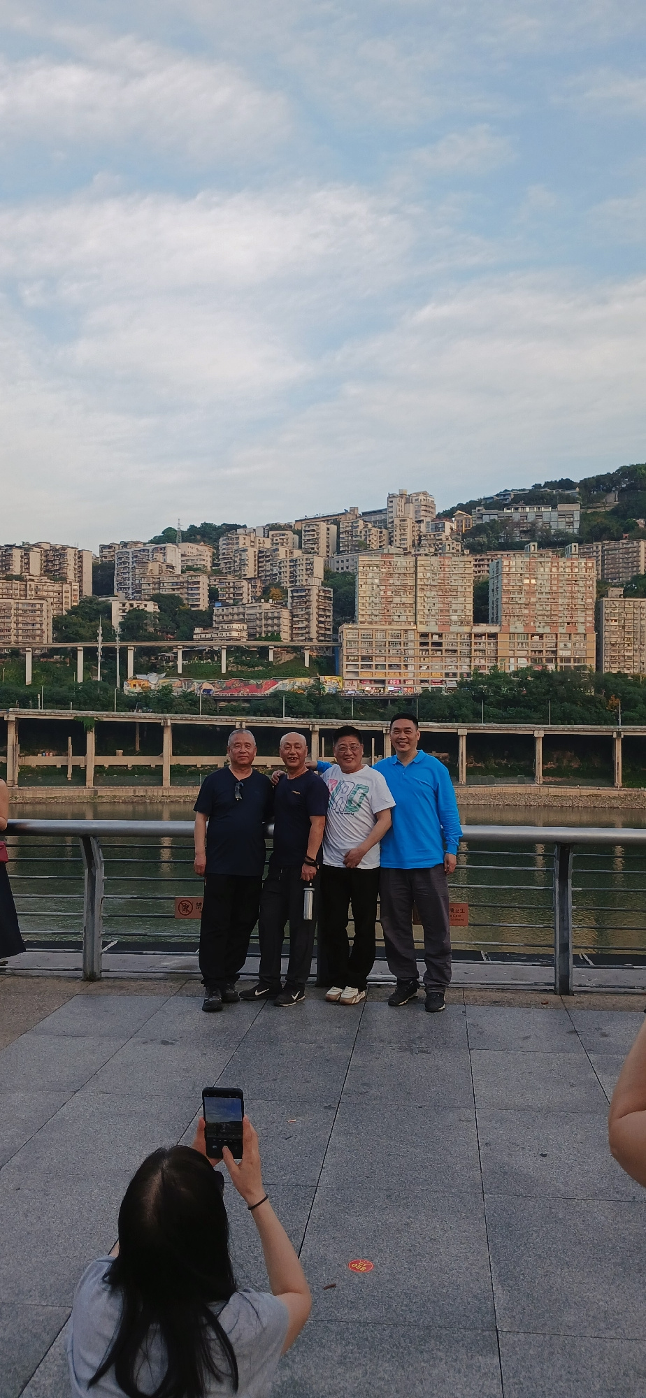 Four men stand in a line along a gray sidewalk, facing the camera. A woman with dark hair and a gray shirt holds a phone, taking a photo. Behind the men, there's a metal railing, a river, and a dense…read more