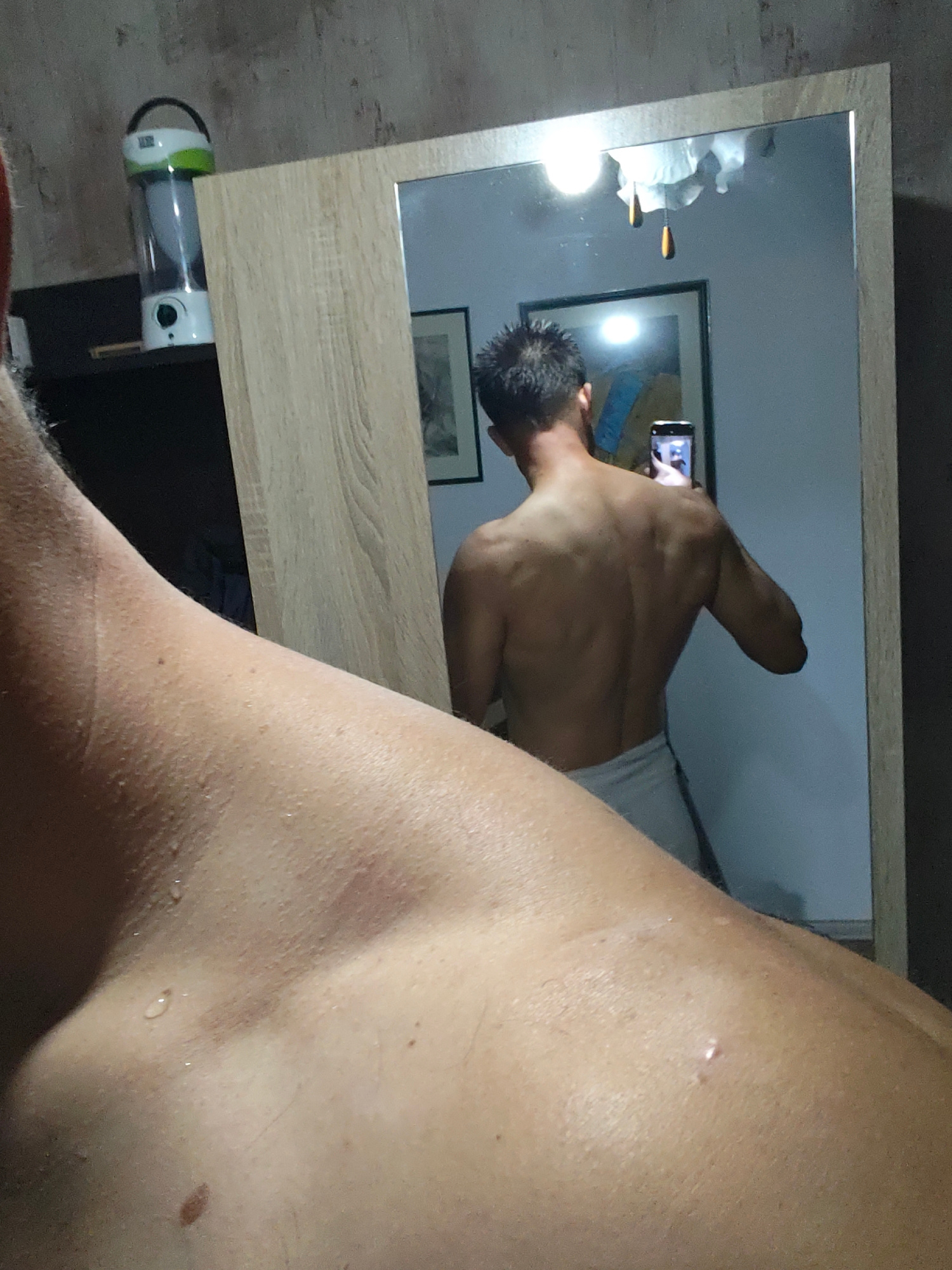 A shirtless man is taking a selfie in front of a mirror. The man is facing away from the viewer and holding a phone in his right hand. The mirror is reflecting his back and the surrounding room. A fraβ¦read more