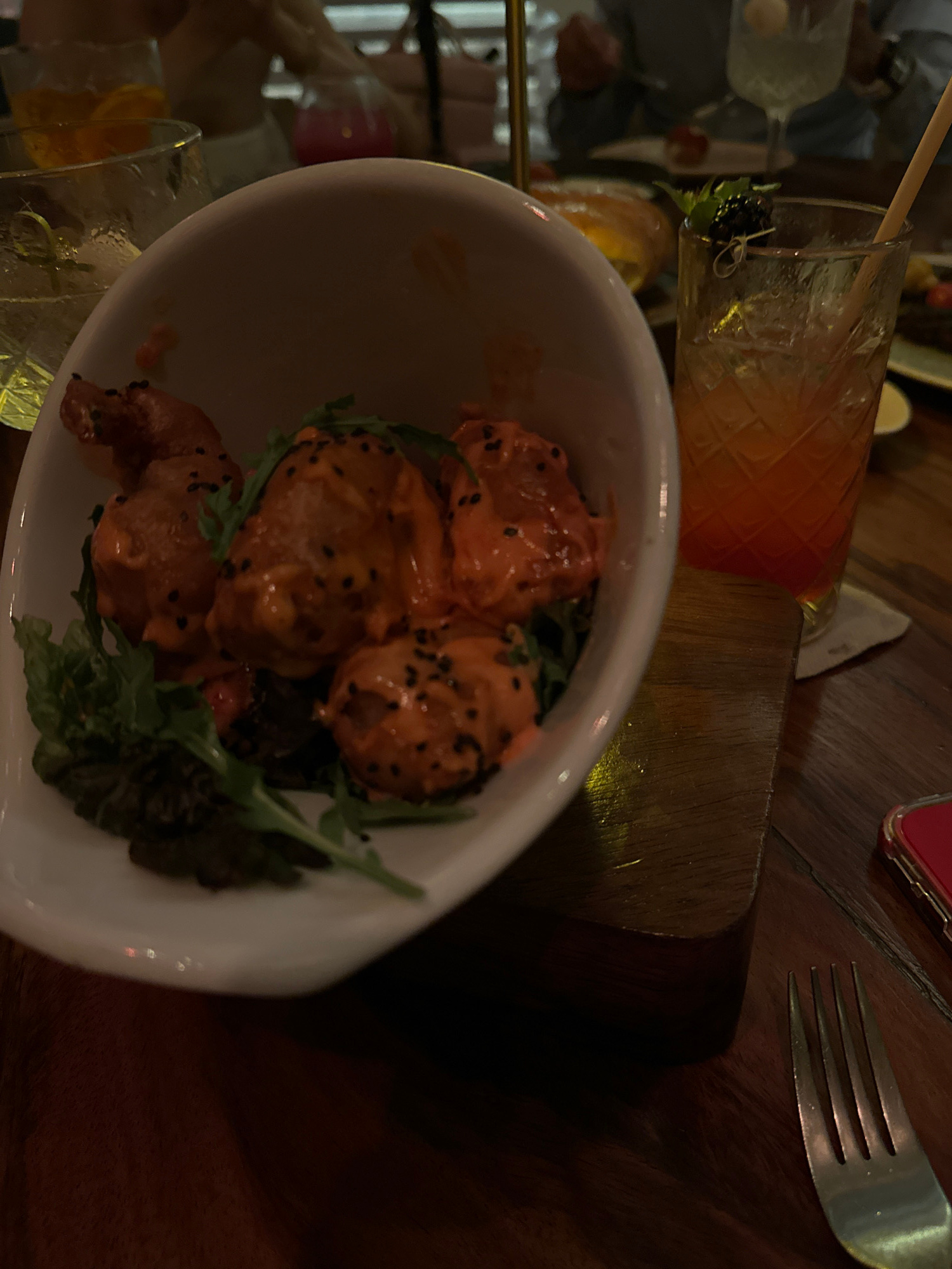 The image captures a close-up, slightly angled view of a meal setting, likely within a restaurant. A white bowl containing a dish with what appears to be pieces of meat or seafood covered in a reddishβ¦read more