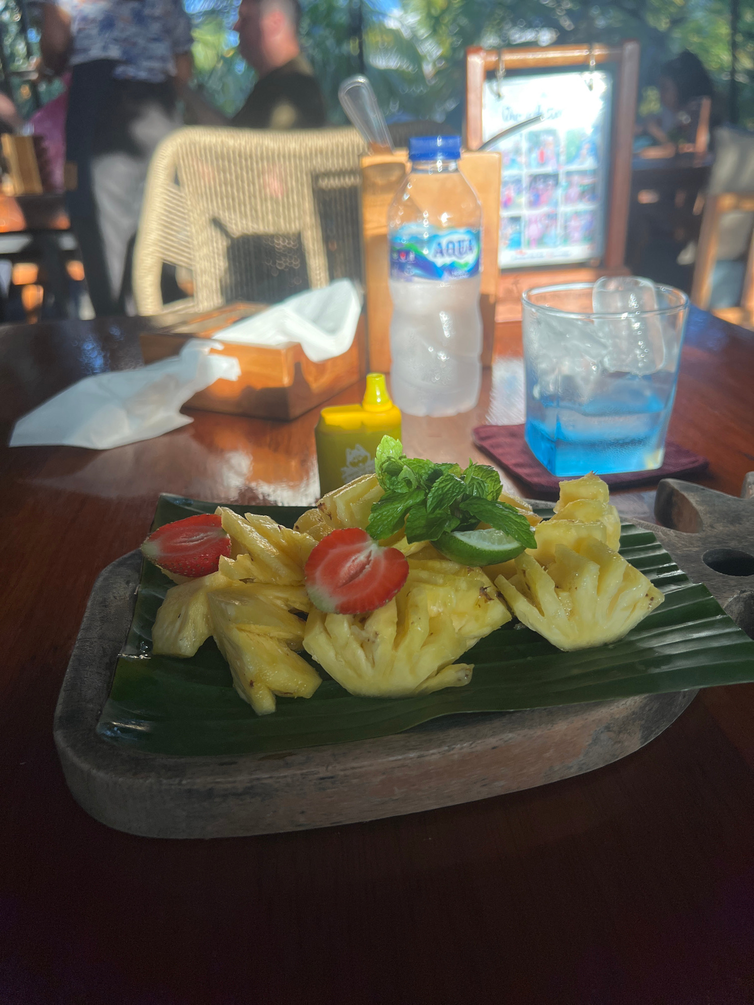 The image shows a table at a restaurant in North Kuta, Indonesia. The table is set with a glass of water, a bottle of Aqua water, a wooden plate of pineapple and strawberries, a lime wedge, mint sprig…read more