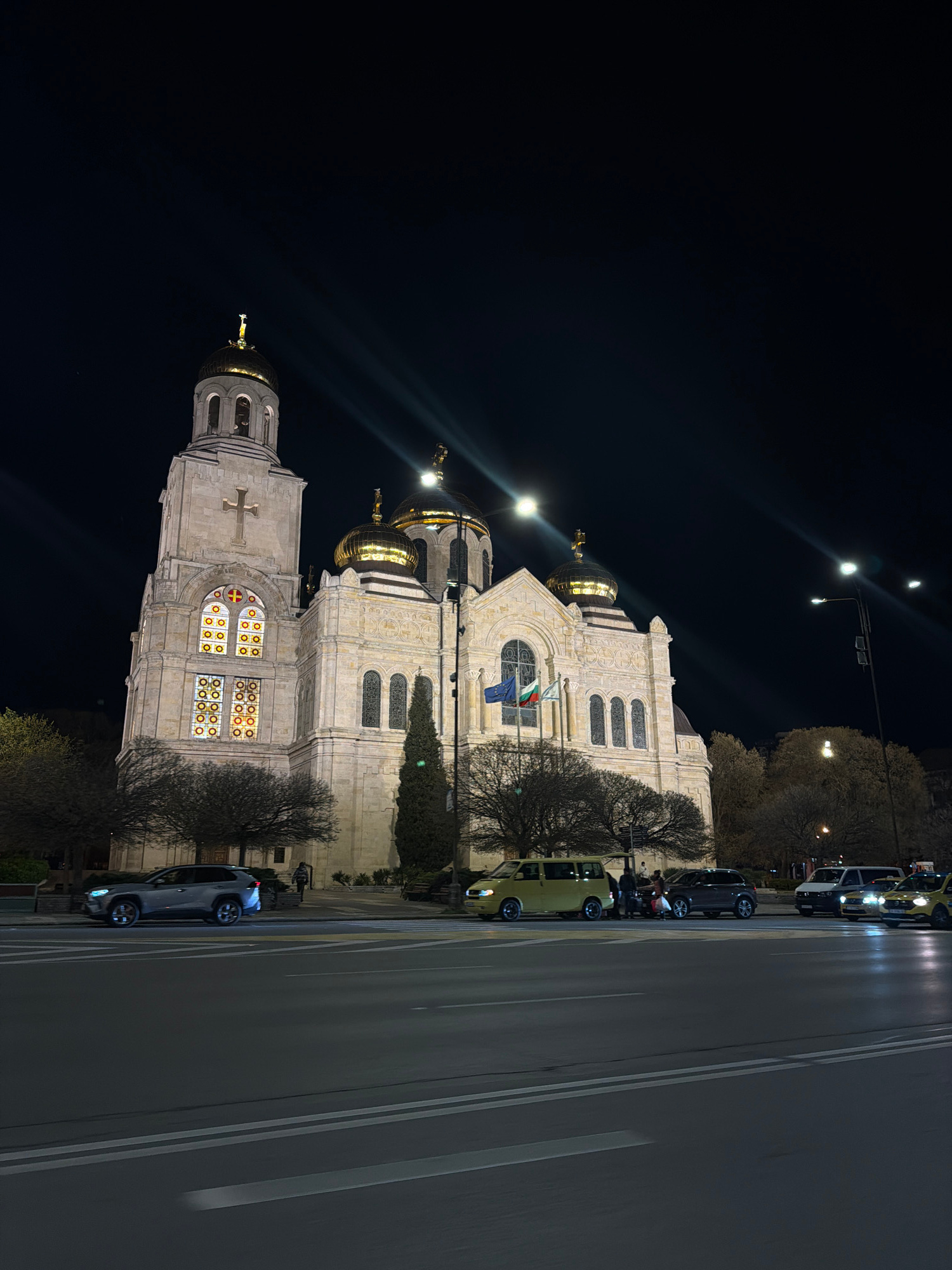 At night, the Dormition of the Mother of God Cathedral in Varna, Bulgaria, is illuminated, showcasing its golden domes and detailed stone facade. A Bulgarian flag hangs near the entrance. Cars are par…read more