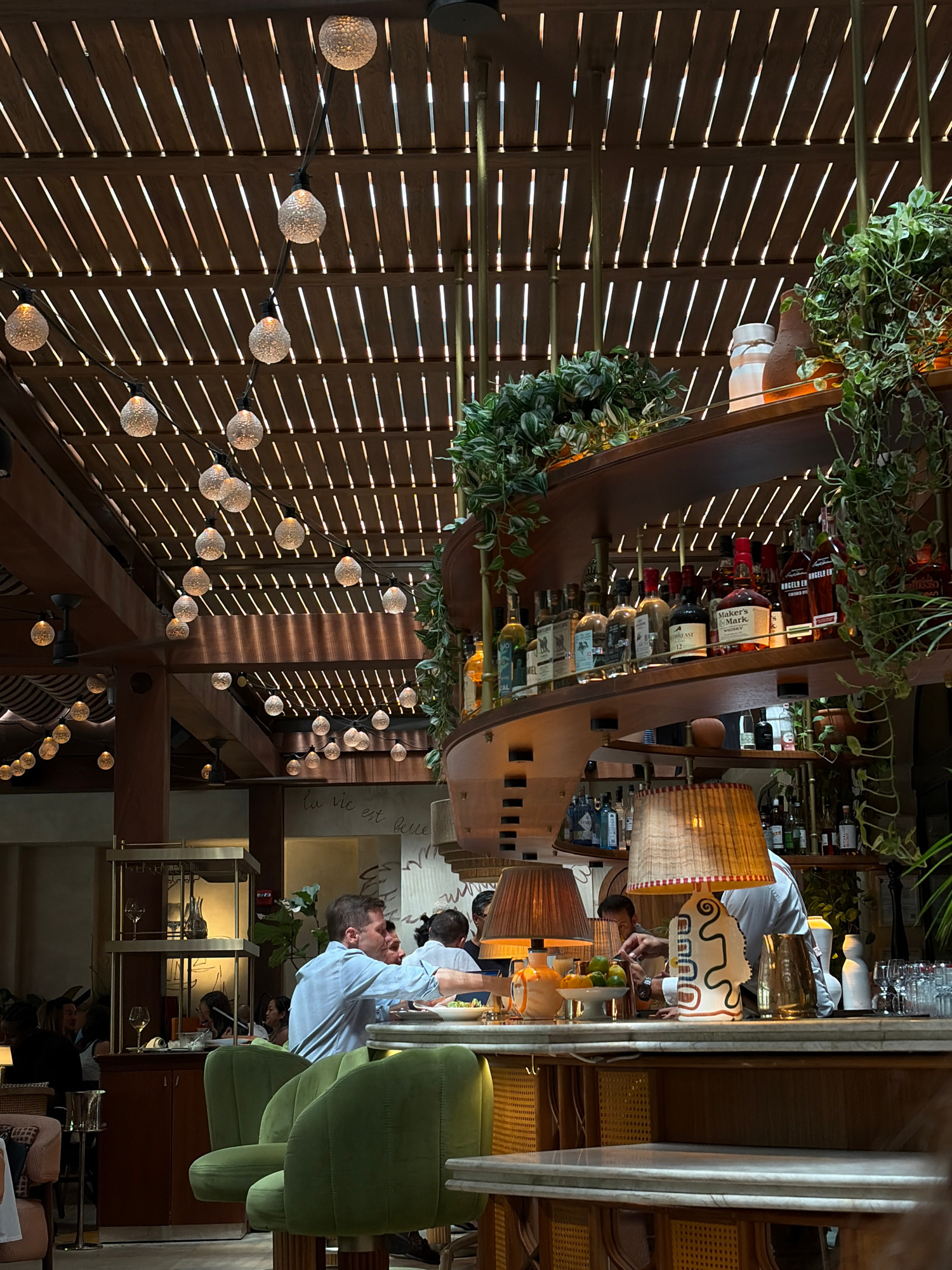 The image shows an interior scene of a restaurant. At the center is a curved bar with a wooden frame, stocked with bottles of liquor and adorned with greenery on top. Above the bar, a wooden lattice c…read more