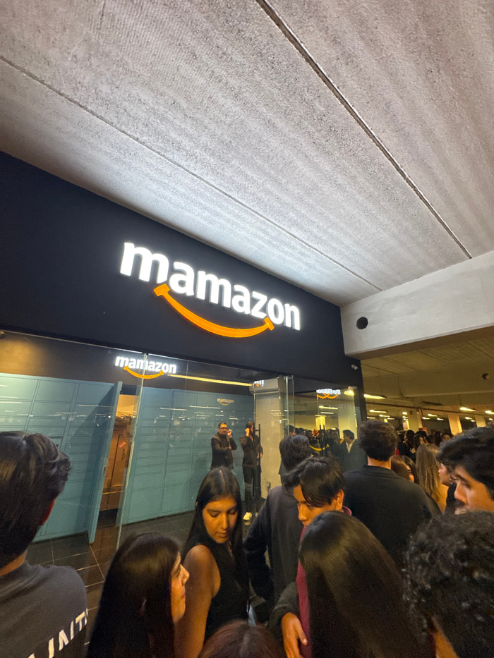 A skewed perspective shows a crowd near an Amazon pickup location, branded "mamazon." The Amazon logo is prominently displayed on a black wall. People are lined up in front of lockers, some looking at…read more