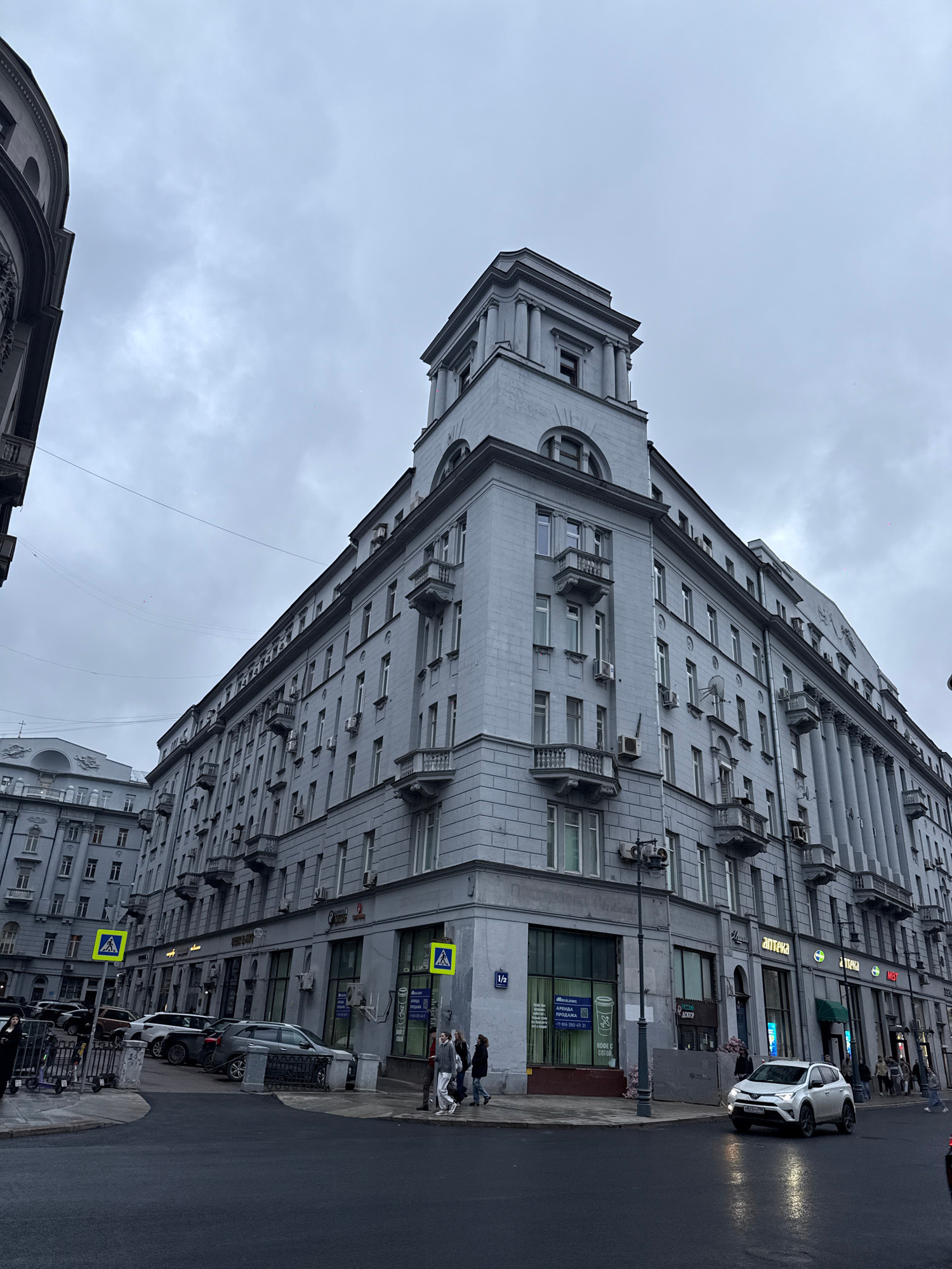 The image depicts a view of a building and street scene in Moscow, Russia. The building is tall and gray, with multiple windows and architectural details. The sky is overcast. Pedestrians are walking…read more