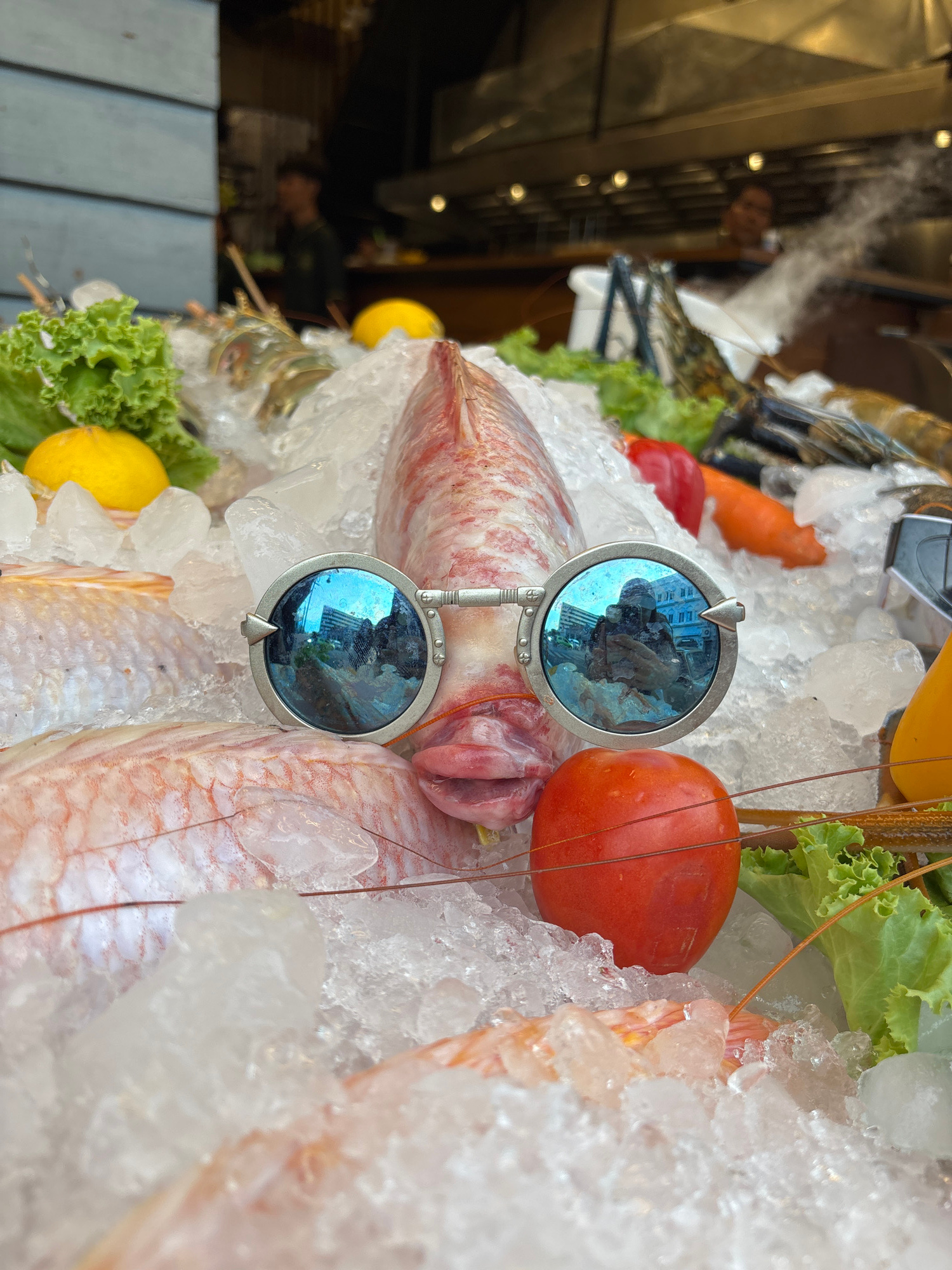 The image shows a display of seafood on ice, likely in a market or restaurant in Phuket City Municipality, Thailand. Fish, shrimp, vegetables (tomato, lettuce, pepper, and lemon), and other seafood ar…read more