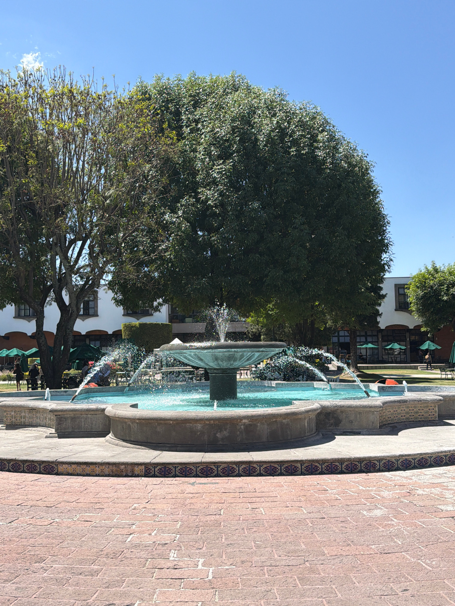 The image displays an outdoor plaza or courtyard in San Andrés Cholula, Mexico, under a clear blue sky. A multi-tiered stone fountain, centrally positioned, actively sprays blue water. The fountain's…read more