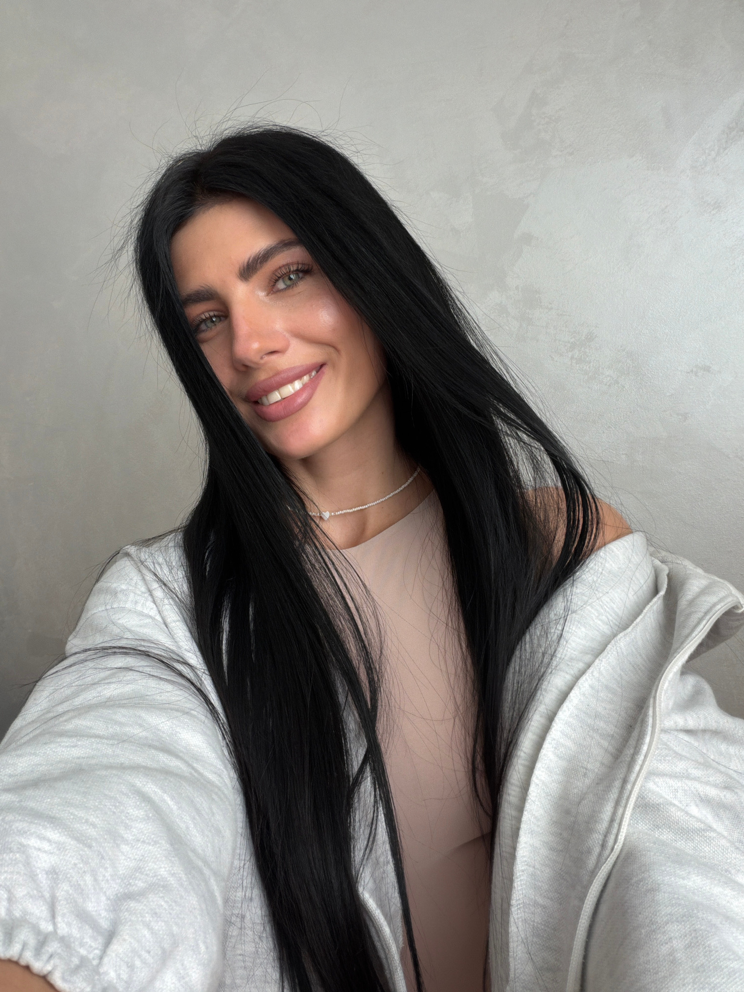 A woman with long, dark hair is smiling and looking directly at the camera. She has green eyes and fair skin. She is wearing a light pink or beige top and a thin silver necklace. The woman is partiall…read more