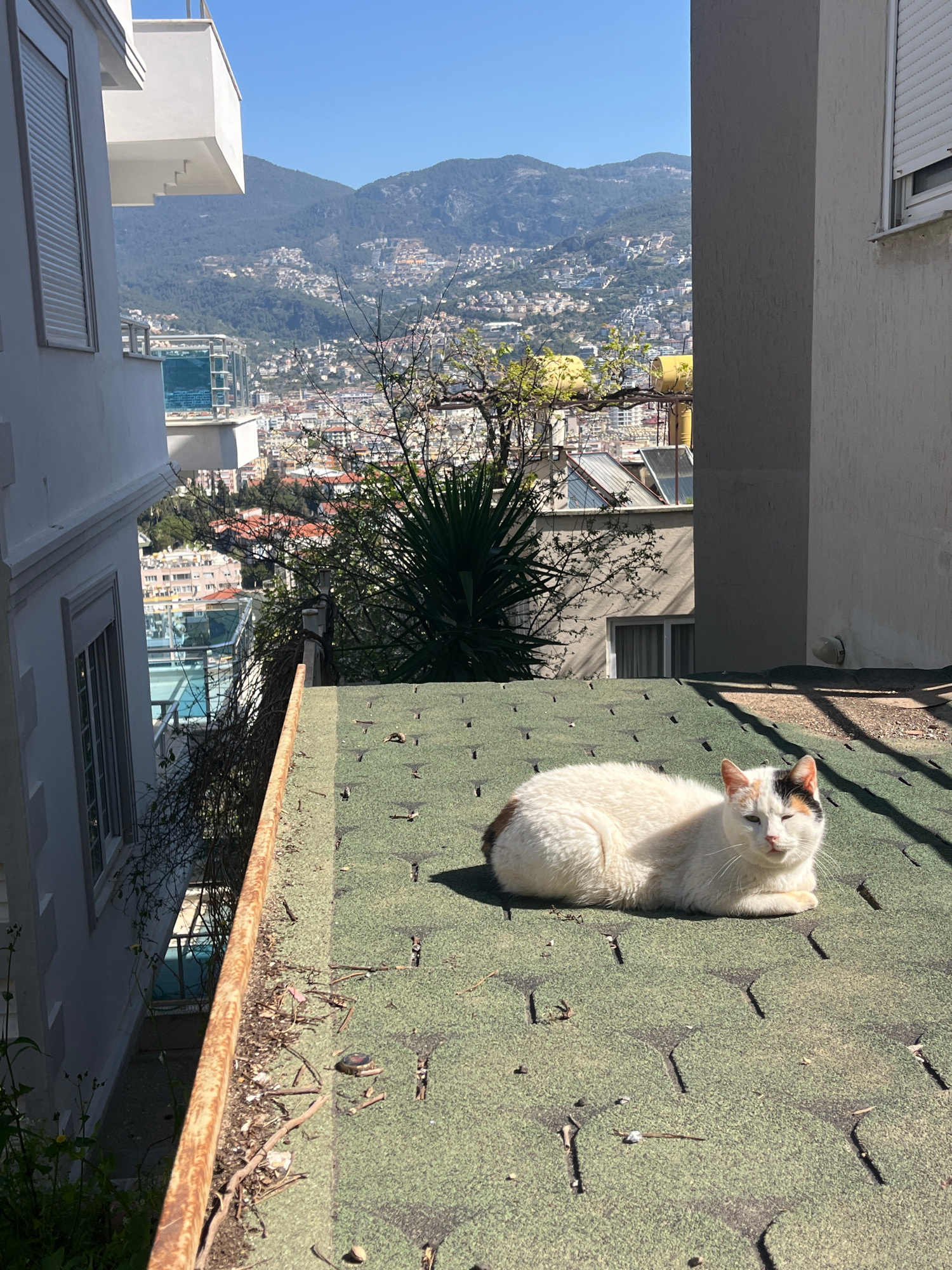 A horizontal, eye-level shot depicts a white cat with dark patches lying on a green roof. The roof appears aged and has a rusty gutter along its edge. A few branches and debris are caught in the gutteβ¦read more