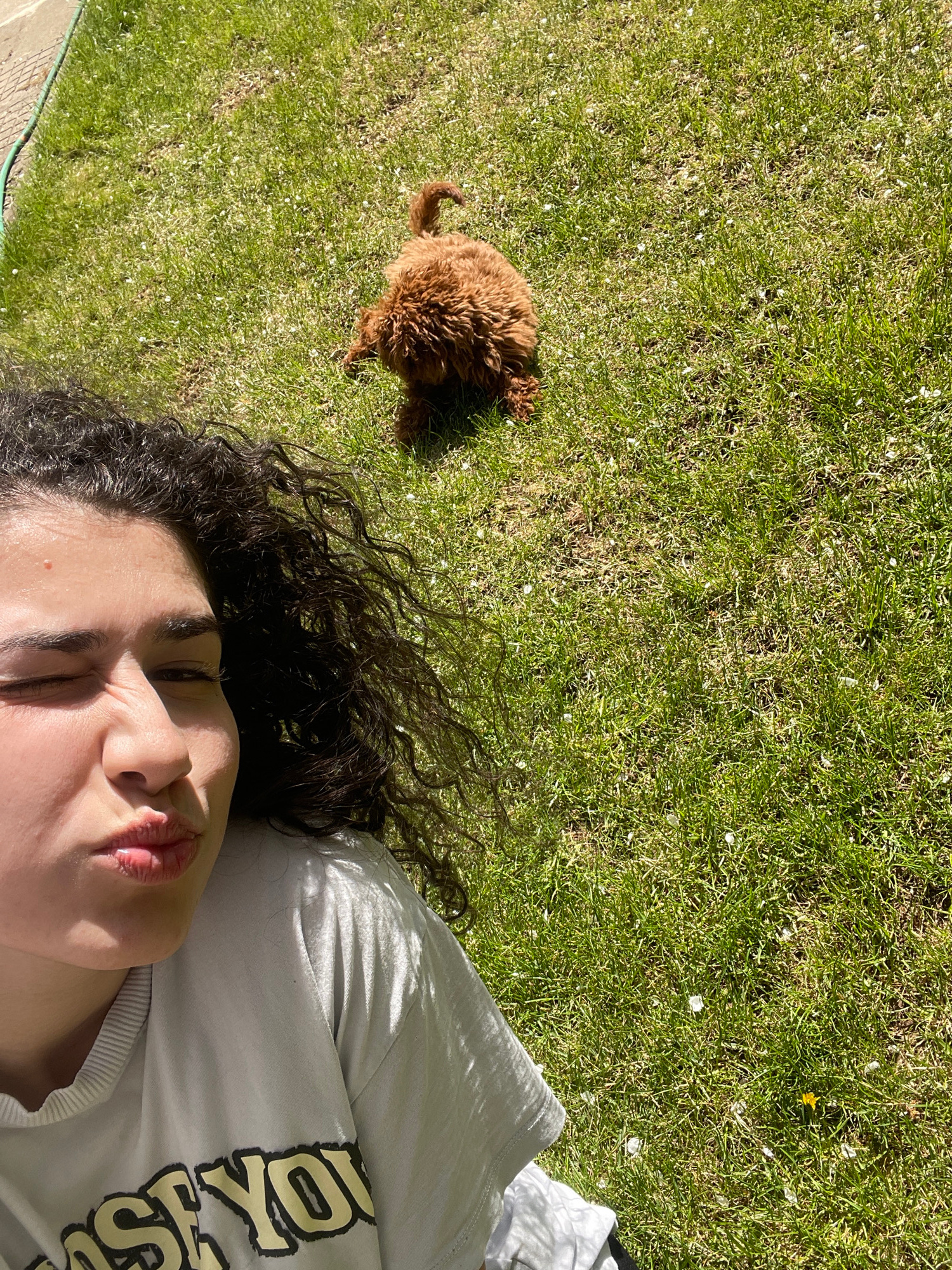 This media file captures a peaceful outdoor scene in Sofia, Bulgaria, on a bright, sunny day. A person, likely female, is lying on their back on vibrant green grass. Their dark, curly hair spreads aro…read more