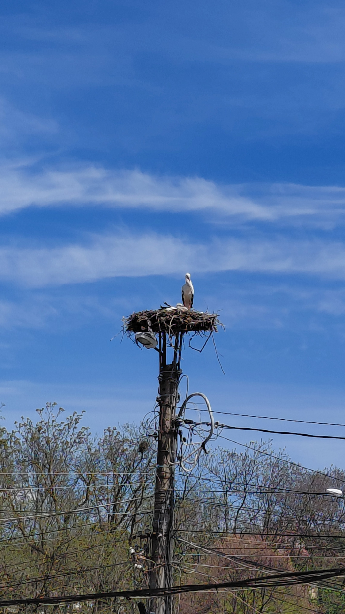 A daytime, upward-angle shot depicts a stork nesting atop a utility pole. The pole is situated on a street in Unknown, Unknown. Bare branches and budding foliage indicate early spring. The nest, a lar…read more