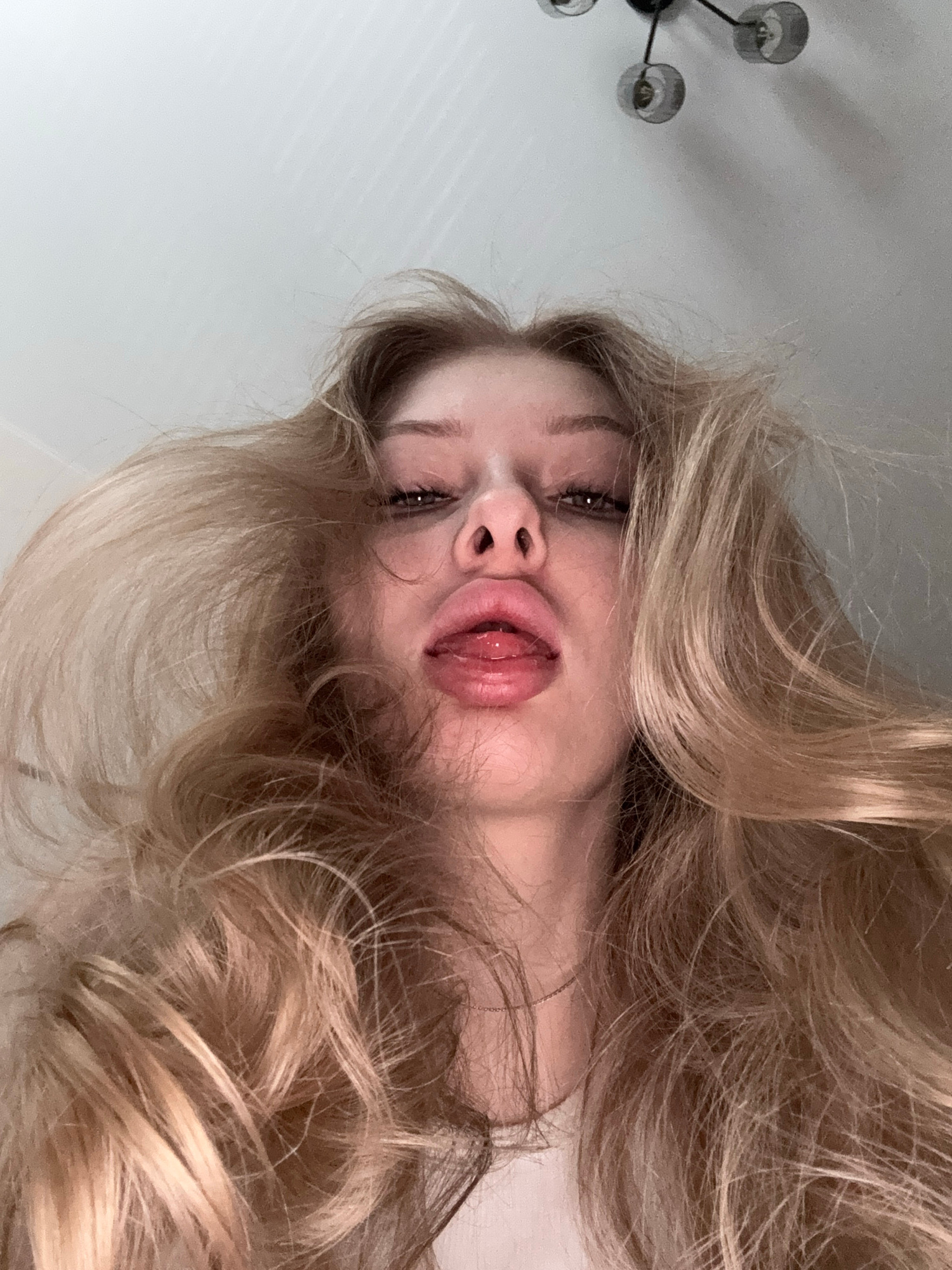 A close-up, tilted, low-angle shot of a woman with long, blonde, wavy hair. Her face is prominent, with emphasis on her lips, which are slightly parted, revealing her tongue. Her eyes are partially closed. A chandelier is visible in the upper left corner of the frame. The background appears to be a plain white wall. There is no indication of location or city. | Open Wire