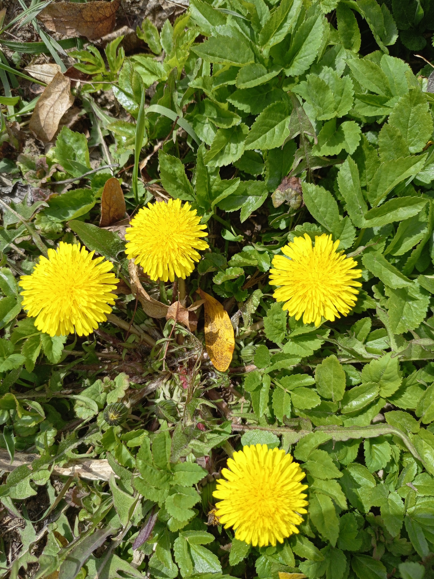 The image shows a ground-level view of a patch of vegetation, prominently featuring four yellow dandelion flowers in full bloom. The flowers are interspersed among various types of green foliage, incl…read more