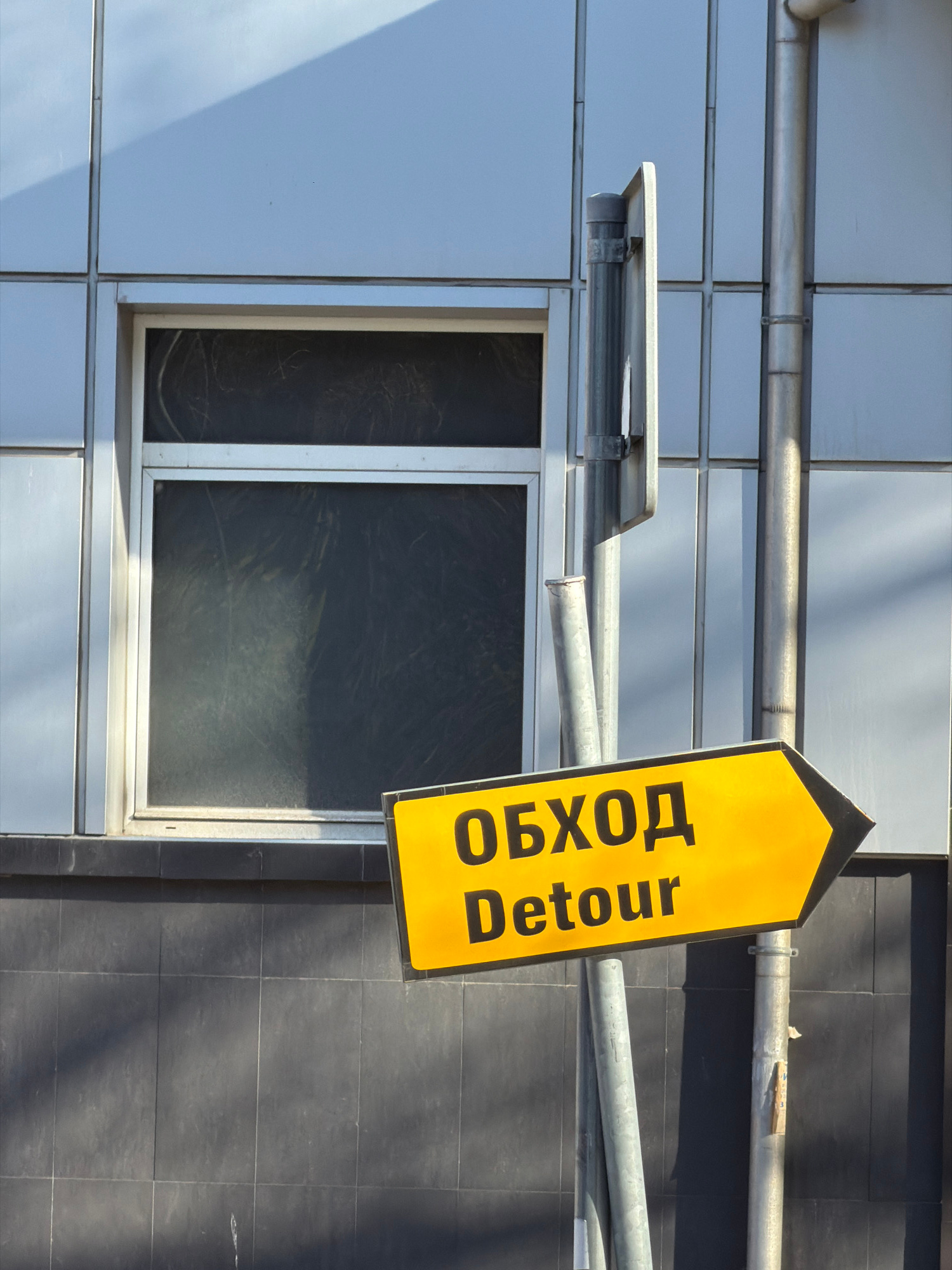 The image shows a yellow "Detour" sign, with the Cyrillic word "ОБХОД" above it, mounted on a metal pipe affixed to the side of a building. The building has a modern facade composed of light gray pane…read more