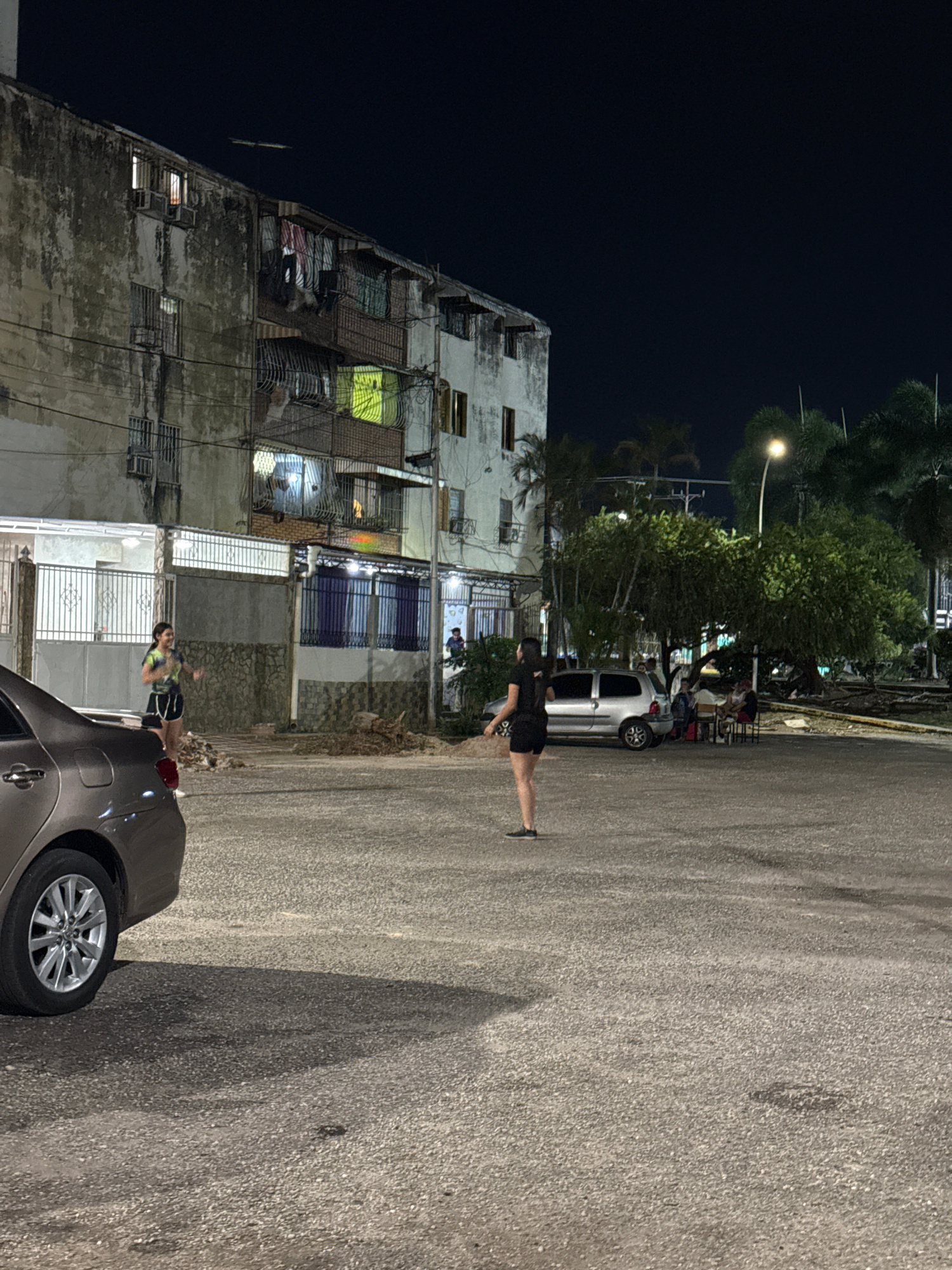 The image shows a street scene in Tinaquillo, Venezuela at night. On the left is a multi-story building with visible windows, some illuminated. In the foreground, two individuals are present. One pers…read more