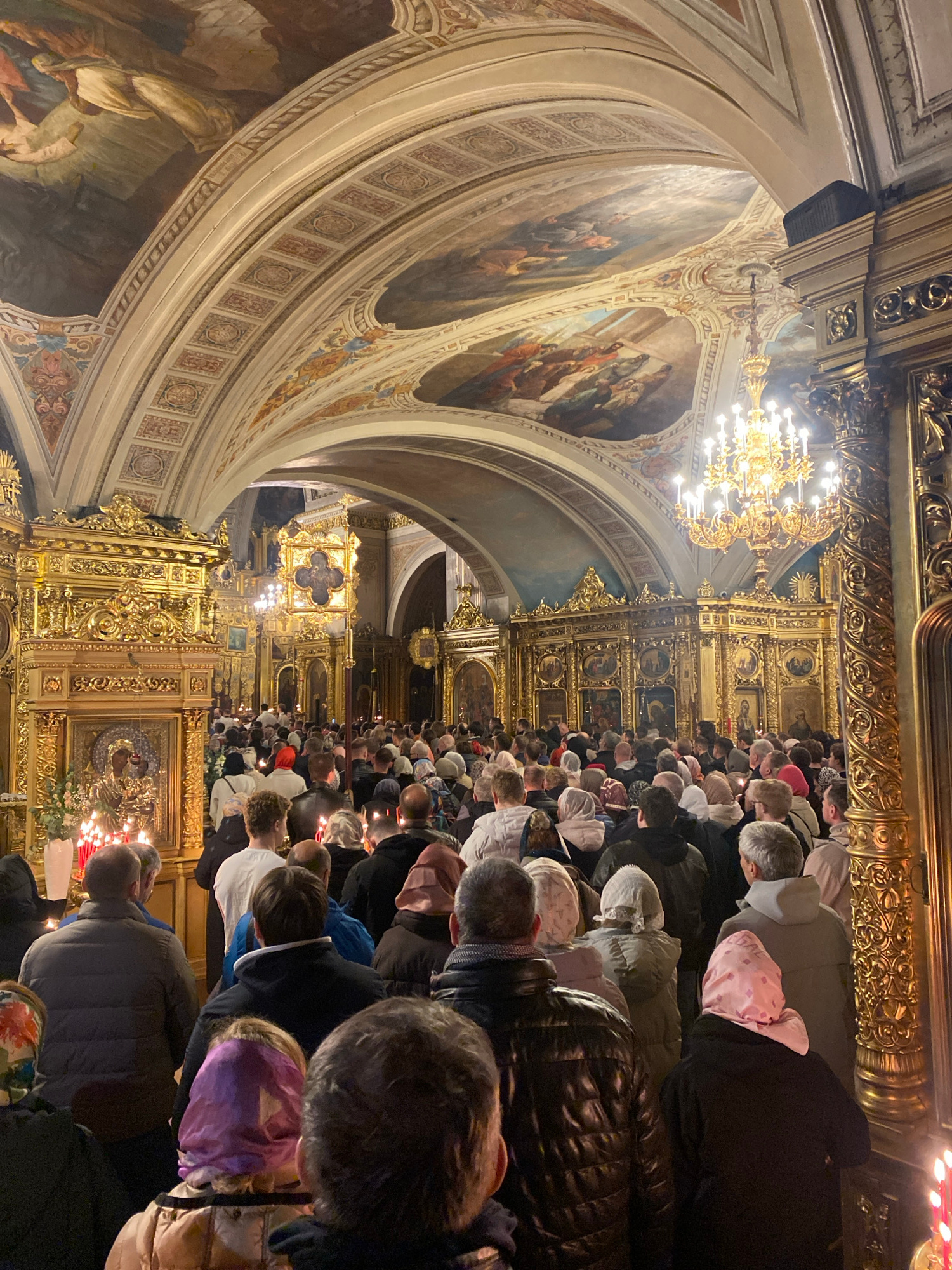 A low-angle, canted medium shot shows a packed cathedral with people facing the front with their heads bowed. The interior of the cathedral is ornate with gold leaf decor, frescoes, and lit chandelier…read more