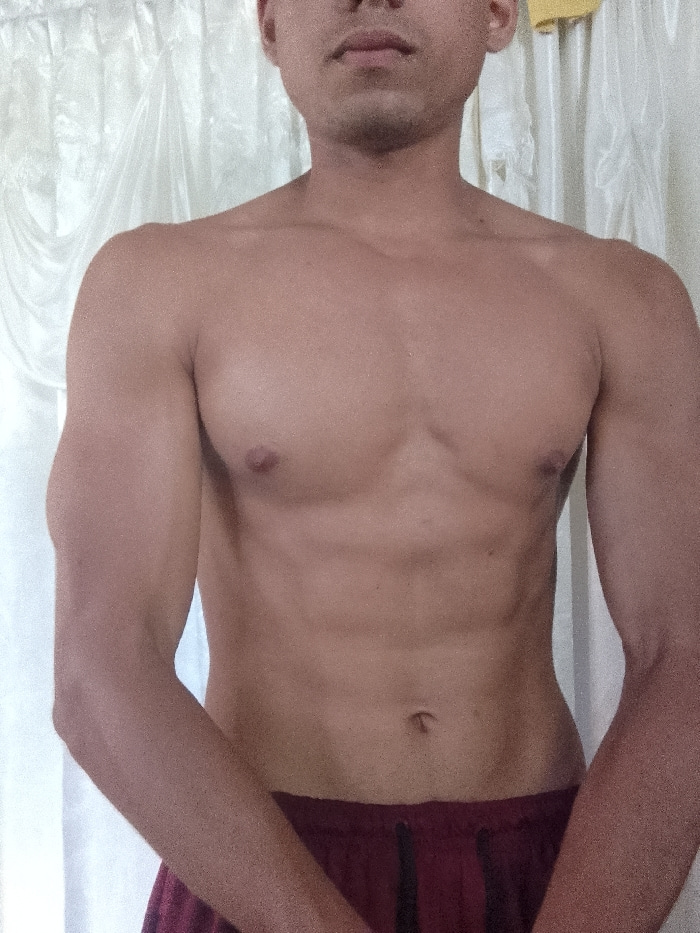 The image displays a male individual, partially cropped from the mid-chest to the upper thighs, standing shirtless. The subject exhibits a light brown skin tone and a muscular physique, with visible d…read more