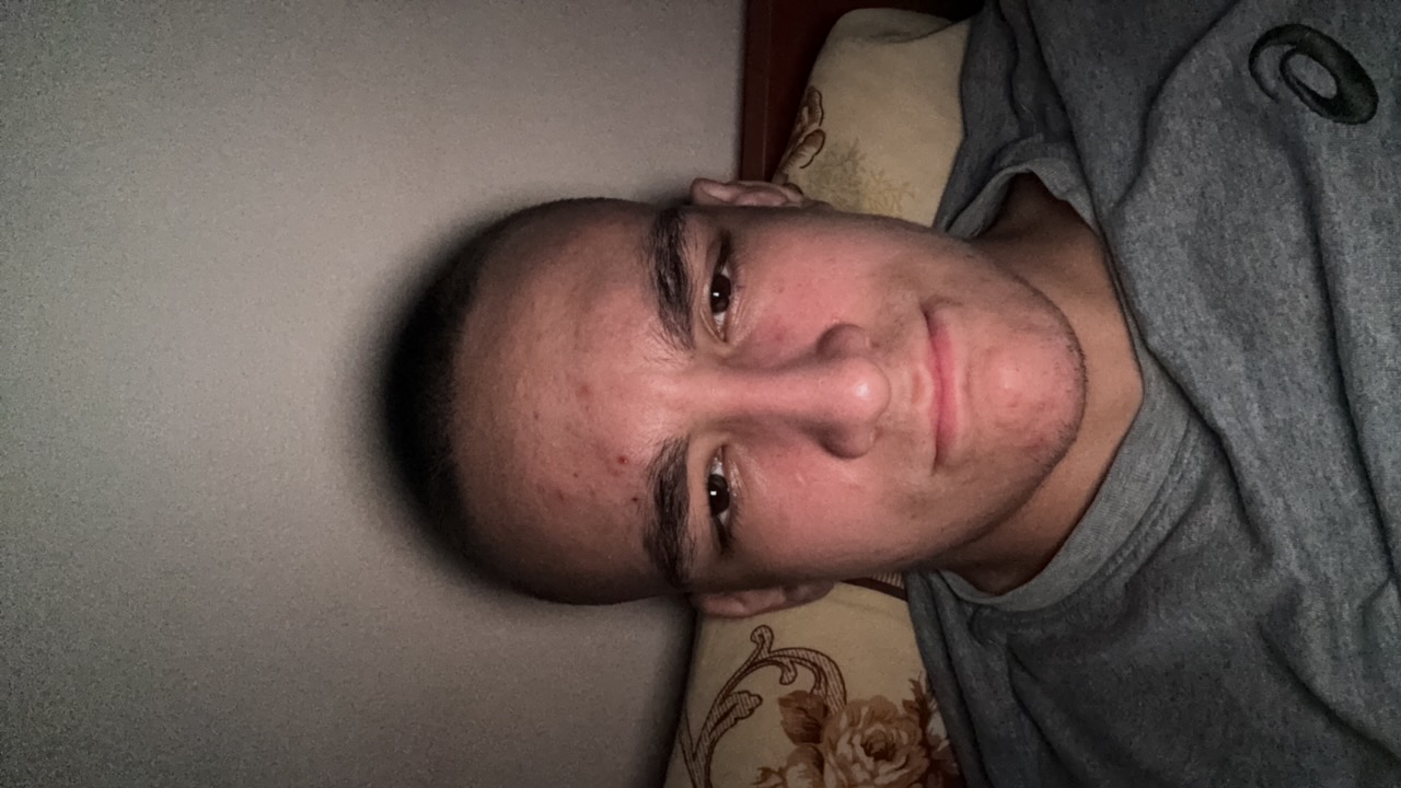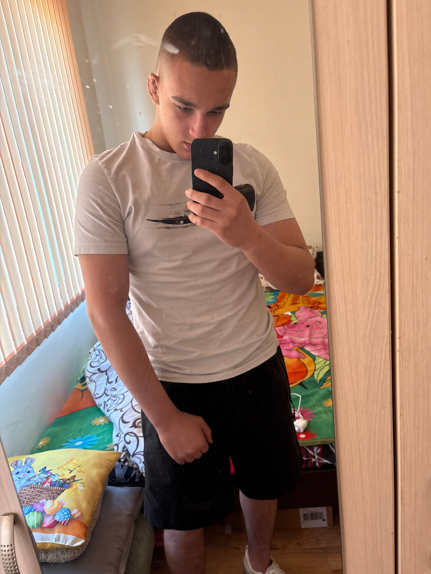 A young man is taking a selfie in a mirror. He is wearing a white t-shirt and black shorts. His hair is short. The background shows a window with blinds, a bed with colorful pillows, and a wall with a…read more